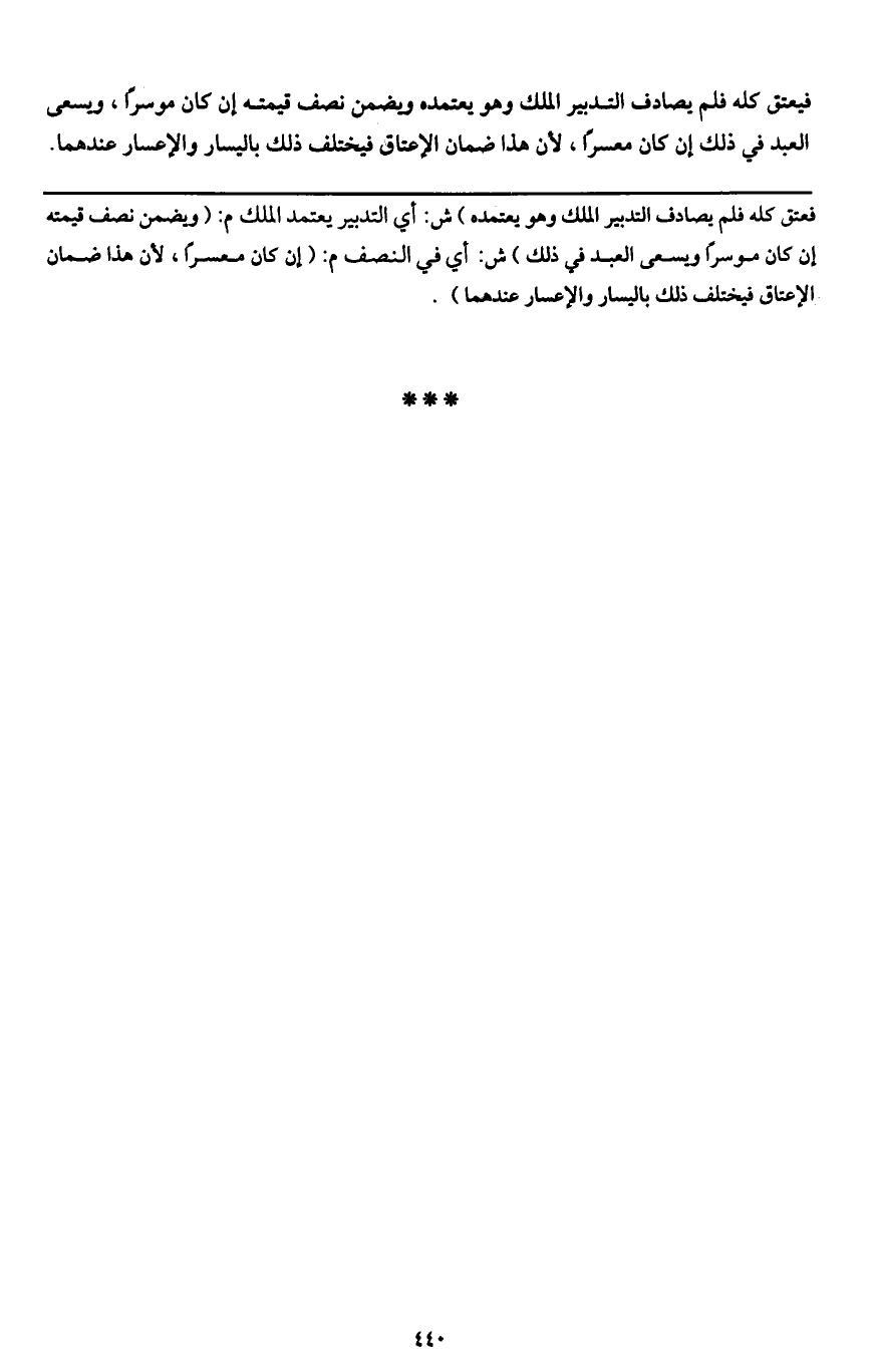 ـــــــــــــــــــــــــــــQفعتق كله فلم يصادف التدبير الملك وهو يعتمده) ش: أي التدبير يعتمد الملك م: (ويضمن نصف قيمته إن كان موسرا ويسعى العبد في ذلك) ش: أي في النصف م: (إن كان معسرا؛ لأن هذا ضمان الإعتاق فيختلف ذلك باليسار والإعسار عندهما) .
