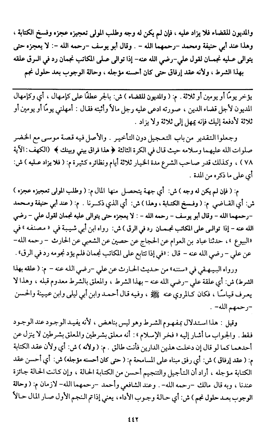 وقيل: هذا استدلال بمفهوم الشرط وهو ليس بناهض؛ لأنه يفيد الوجود عند الوجود فقط. والجواب ما أشار إليه " فخر الإسلام ": أنه معلق بشرطين والمعلق بشرطين لا ينزل عن أحدهما كما لو قال إن دخلت هذين الدارين فأنت طالق. م: (ولأنه) ش: أي ولأن عقد الكتابة م: (عقد إرفاق) ش: أي رفق مبناه على المسامحة م: (حتى كان أحسنه مؤجله) ش: أي أحسن عقد الكتابة مؤجله، أراد أن التأجيل والتنجيم أحسن من الكتابة الحالة، وإن كانت الحالة جائزة عندنا، وبه قال مالك - رَحِمَهُ اللَّهُ -. وعند الشافعي وأحمد - رحمهما الله - لازمان م: (وحالة الوجوب بعد حلول نجم) ش: أي حالة وجوب الأداء، يعني إذا تم النجم الأول صار المال حالا