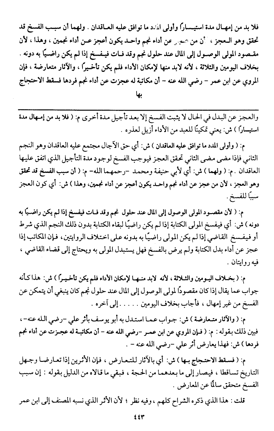 وأولى المدد ما توافق عليه العاقدان. ولهما أن سبب الفسخ قد تحقق وهو العجز؛ لأن من صبر عن أداء نجم واحد يكون أعجز عن أداء نجمين، وهذا؛ لأن مقصود المولى الوصول إلى المال عند حلول نجم وقد فات فيفسخ إذا لم يكن راضيا به دونه. بخلاف اليومين والثلاثة؛ لأنه لا بد منها لإمكان الأداء فلم يكن تأخيرا، والآثار متعارضة، فإن المروي عن ابن عمر - رَضِيَ اللَّهُ عَنْهُ - أن مكاتبة له عجزت عن أداء نجم فردها فسقط الاحتجاج بها