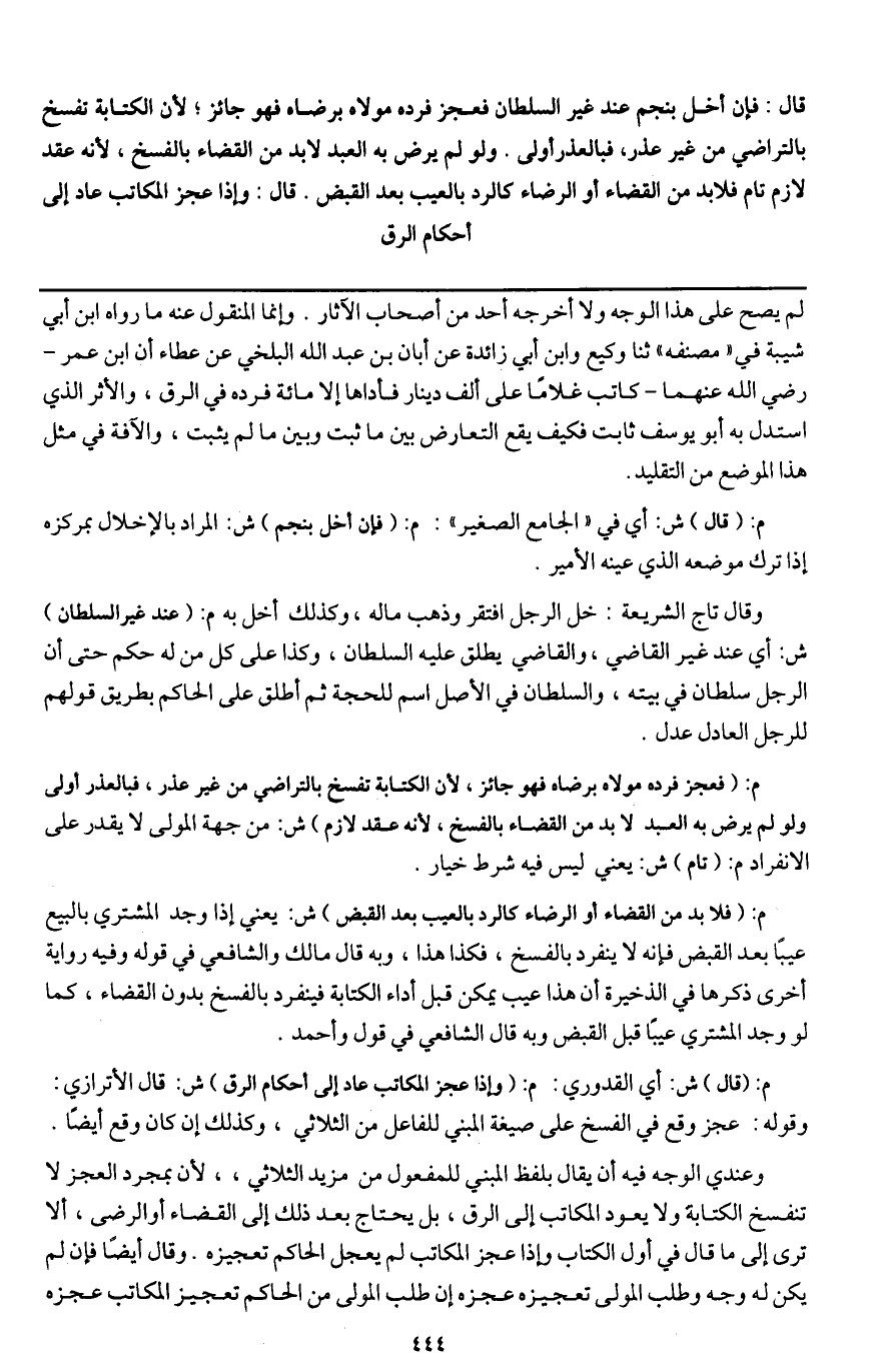 قال: فإن أخل بنجم عند غير السلطان فعجز فرده مولاه برضاه فهو جائز؛ لأن الكتابة تفسخ بالتراضي من غير عذر، فبالعذر أولى. ولو لم يرض به العبد لا بد من القضاء بالفسخ؛ لأنه عقد لازم تام فلا بد من القضاء أو الرضاء كالرد بالعيب بعد القبض. قال: وإذا عجز المكاتب عاد إلى أحكام الرق