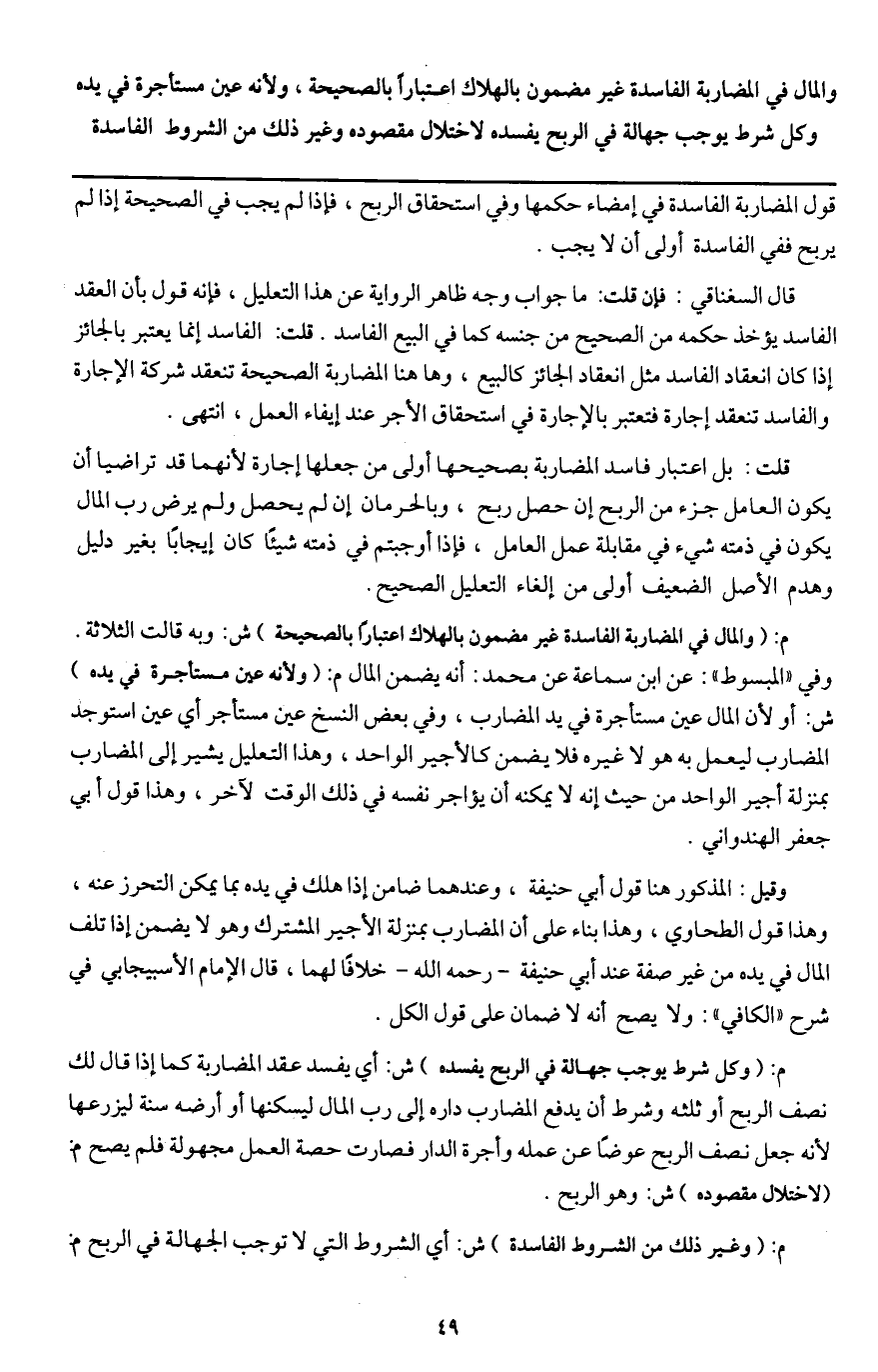 ـــــــــــــــــــــــــــــQقول المضاربة الفاسدة في إمضاء حكمها وفي استحقاق الربح، فإذا لم يجب في الصحيحة إذا لم يربح ففي الفاسدة أولى أن لا يجب.
