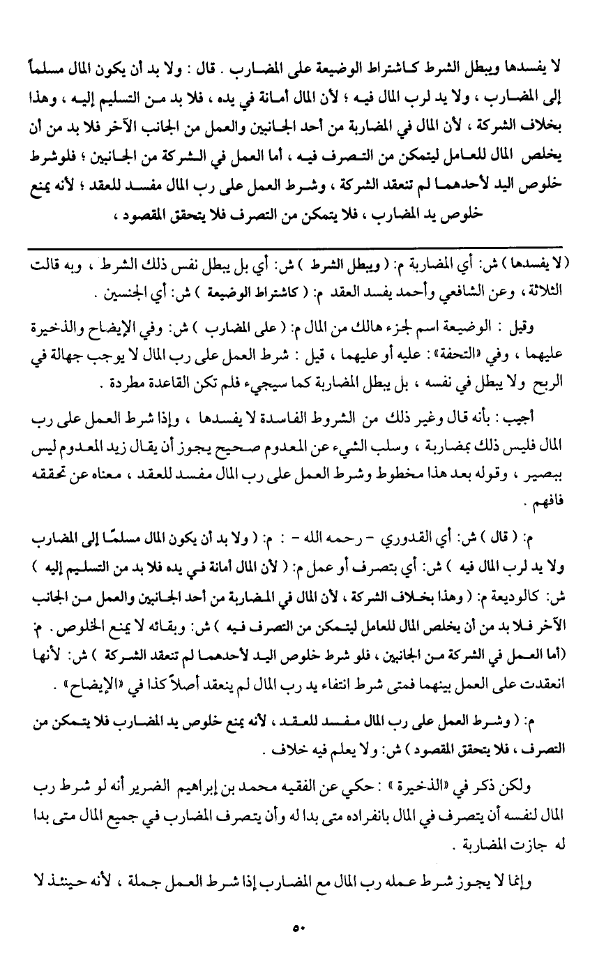 قال: ولا بد أن يكون المال مسلما إلى المضارب، ولا يد لرب المال فيه؛ لأن المال أمانة في يده، فلا بد من التسليم إليه، وهذا بخلاف الشركة؛ لأن المال في المضاربة من أحد الجانبين والعمل من الجانب الآخر فلا بد من أن يخلص المال للعامل ليتمكن من التصرف فيه، أما العمل في الشركة من الجانبين فلو شرط خلوص اليد لأحدهما لم تنعقد الشركة،