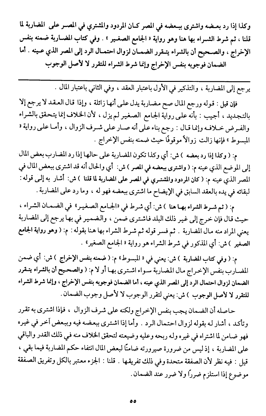وكذا إذا رد بعضه واشترى ببعضه في المصر كان المردود والمشتري في المصر على المضاربة لما قلنا، ثم شرط الشراء بها هنا وهو رواية " الجامع الصغير ". وفي كتاب المضاربة ضمنه بنفس الإخراج، والصحيح أن بالشراء يتقرر الضمان لزوال احتمال الرد إلى المصر الذي عينه. أما الضمان فوجوبه بنفس الإخراج وإنما شرط الشراء للتقرر لا لأصل الوجوب