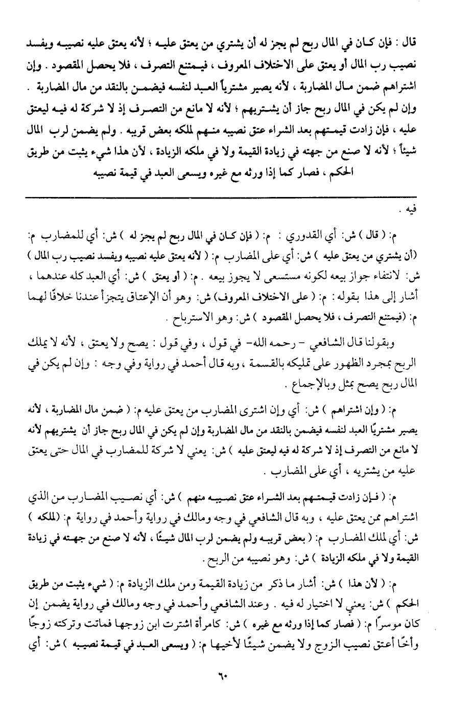 قال: فإن كان في المال ربح لم يجز له أن يشتري من يعتق عليه؛ لأنه يعتق عليه نصيبه ويفسد نصيب رب المال أو يعتق على الاختلاف المعروف، فيمتنع التصرف، فلا يحصل المقصود. وإن اشتراهم ضمن مال المضاربة؛ لأنه يصير مشتريا العبد لنفسه فيضمن بالنقد من مال المضاربة. وإن لم يكن في المال ربح جاز أن يشتريهم؛ لأنه لا مانع من التصرف إذ لا شركة له فيه ليعتق عليه، فإن زادت قيمتهم بعد الشراء عتق نصيبه منهم لملكه بعض قريبه. ولم يضمن لرب المال شيئا؛ لأنه لا صنع من جهته في زيادة القيمة ولا في ملكه الزيادة؛ لأن هذا شيء يثبت من طريق الحكم، فصار كما إذا ورثه مع غيره ويسعى العبد في قيمة نصيبه