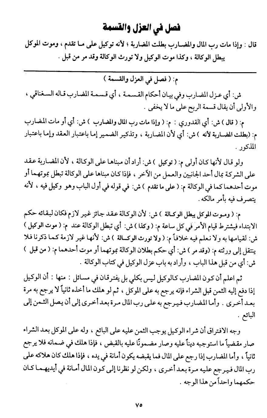 فصل في العزل والقسمة قال: وإذا مات رب المال والمضارب بطلت المضاربة؛ لأنه توكيل على ما تقدم، وموت الموكل يبطل الوكالة، وكذا موت الوكيل ولا تورث الوكالة وقد مر من قبل.