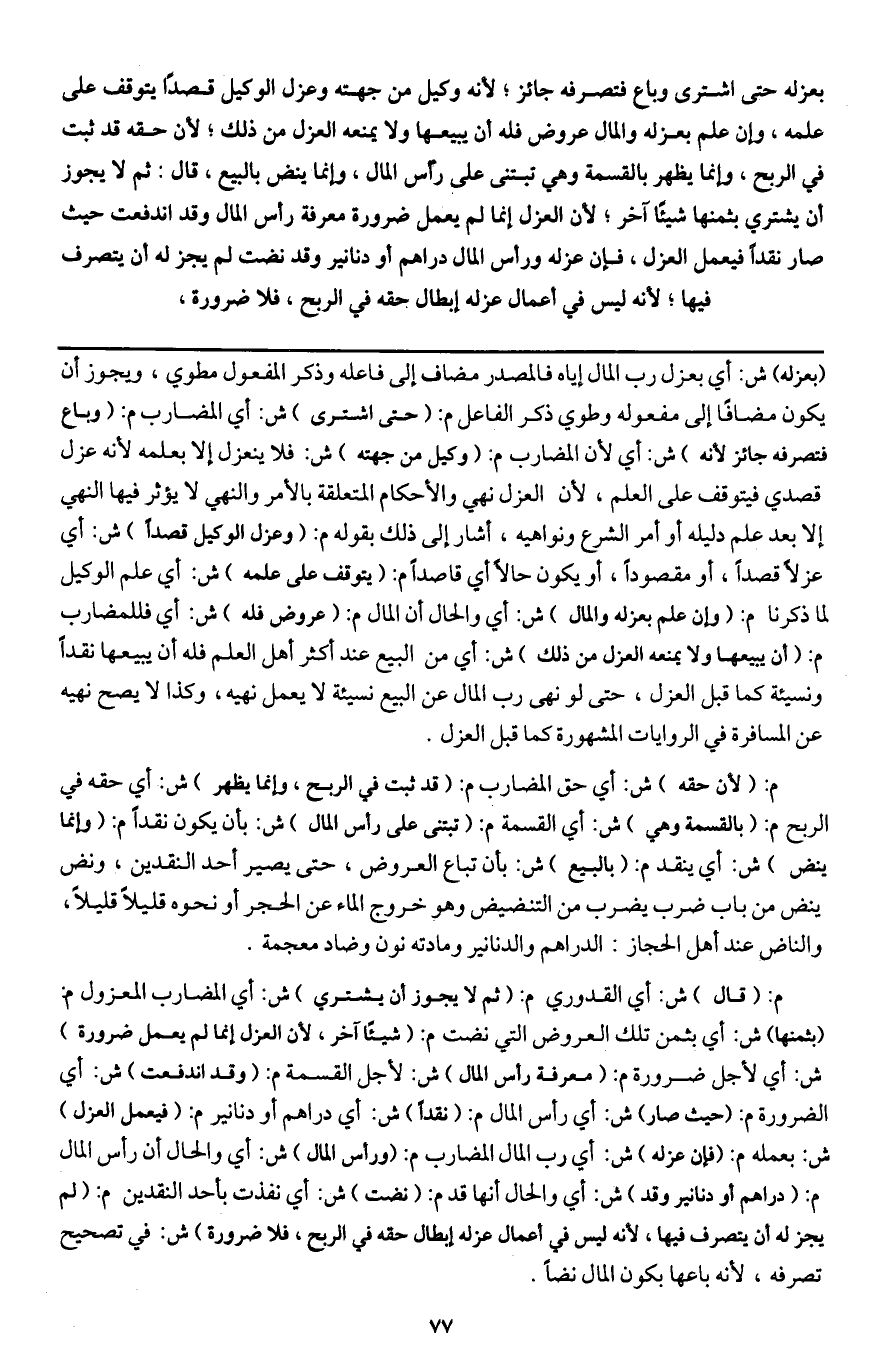 م: (قال) ش: أي القدوري م: (ثم لا يجوز أن يشتري) ش: أي المضارب المعزول م: (بثمنها) ش: أي بثمن تلك العروض التي نضت م: (شيئا آخر، لأن العزل إنما لم يعمل ضرورة) ش: أي لأجل ضرورة م: (معرفة رأس المال) ش: لأجل القسمة م: (وقد اندفعت) ش: أي الضرورة م: (حيث صار) ش: أي رأس المال م: (نقدا) ش: أي دراهم أو دنانير م: (فيعمل العزل) ش: بعمله م: (فإن عزله) ش: أي رب المال المضارب م: (ورأس المال) ش: أي والحال أن رأس المال م: (دراهم أو دنانير وقد) ش: أي والحال أنها قد م: (نضت) ش: أي نفذت بأحد النقدين م: (لم يجز له أن يتصرف فيها، لأنه ليس في أعمال عزله إبطال حقه في الربح، فلا ضرورة) ش: في تصحيح تصرفه، لأنه باعها بكون المال نضا.