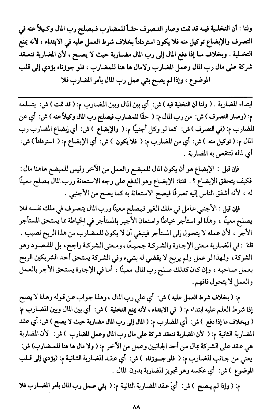 م: (بخلاف شرط العمل عليه) ش: أي على رب المال، وهذا جواب عن قوله وهذا لا يصح إذا شرط العلم عليه ابتداء م: (في الابتداء، لأنه يمنع التخلية) ش: أي بين المال وبين المضارب م: (وبخلاف ما إذا دفع) ش: أي المضارب م: (المال إلى رب المال مضاربة حيث لا يصح) ش: أي عقد المضاربة الثانية م: (لأن المضاربة تنعقد شركة على مال رب المال وعمل المضارب) ش: لأن المضاربة هي عقد على الشركة بمال من أحد الجانبين وعمل من الآخر م: (ولا مال هاهنا للمضارب) ش: يعني من جانب المضارب م: (فلو جوزناه) ش: أي عقد المضاربة الثانية م: (يؤدي إلى قلب الموضوع) ش: أي عكسه وهو تجويز المضاربة بدون المال.