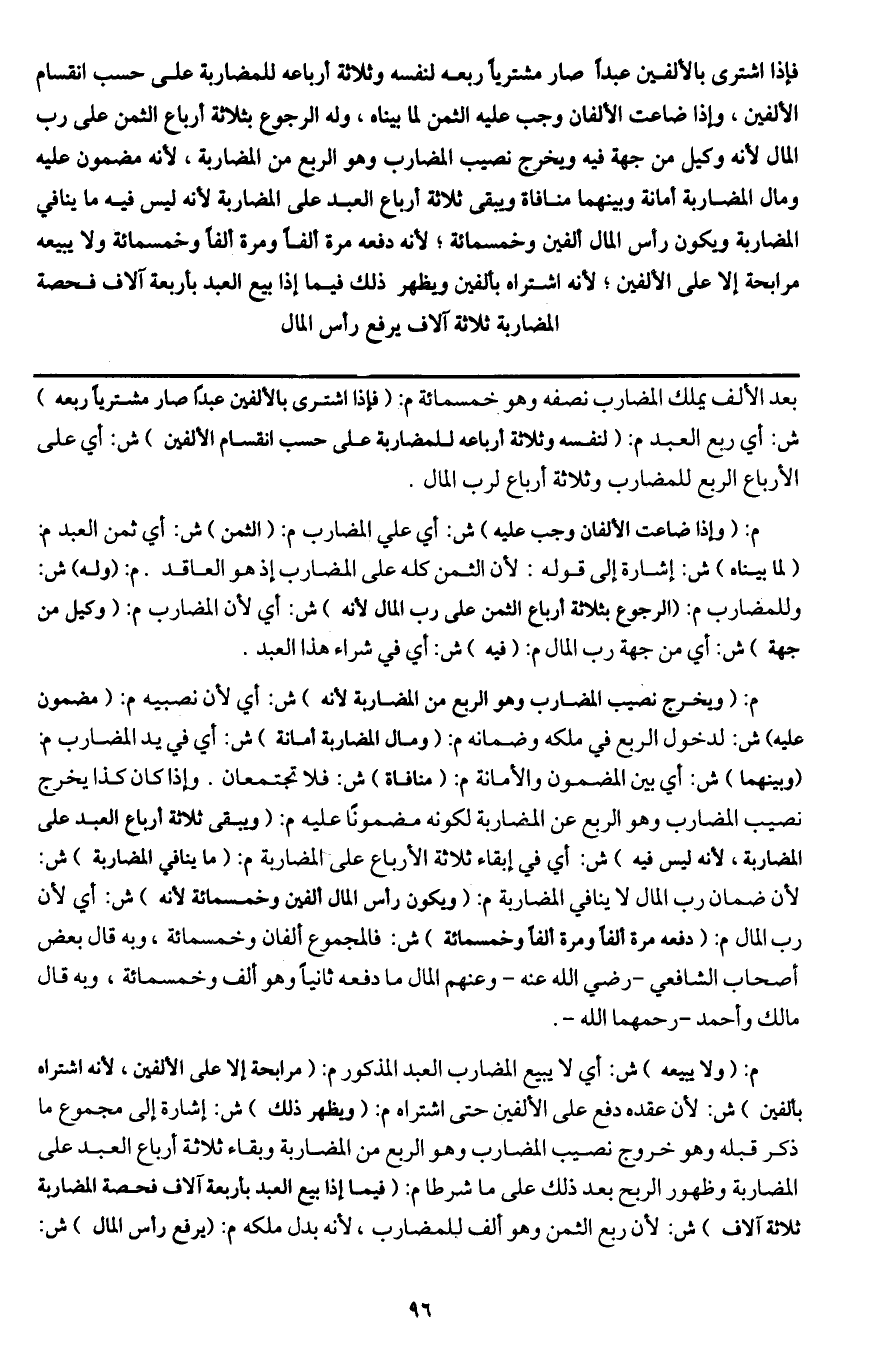 ـــــــــــــــــــــــــــــQبعد الألف يملك المضارب نصفه وهو خمسمائة م: (فإذا اشترى بالألفين عبدًا صار مشتريًا ربعه) ش: أي ربع العبد م: (لنفسه وثلاثة أرباعه للمضاربة على حسب انقسام الألفين) ش: أي على الأرباع الربع للمضارب وثلاثة أرباع لرب المال.