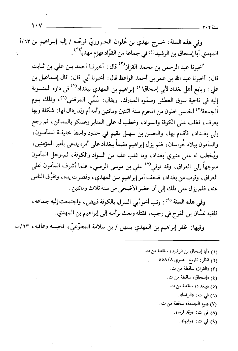 وفي هذه السنة [9] : وثب أخو أبي السرايا بالكوفة فبيض، واجتمعت إليه جماعة، فلقيه غسّان بن الفرج في رجب، فقتله وبعث برأسه إلى إبراهيم بن المهدي.