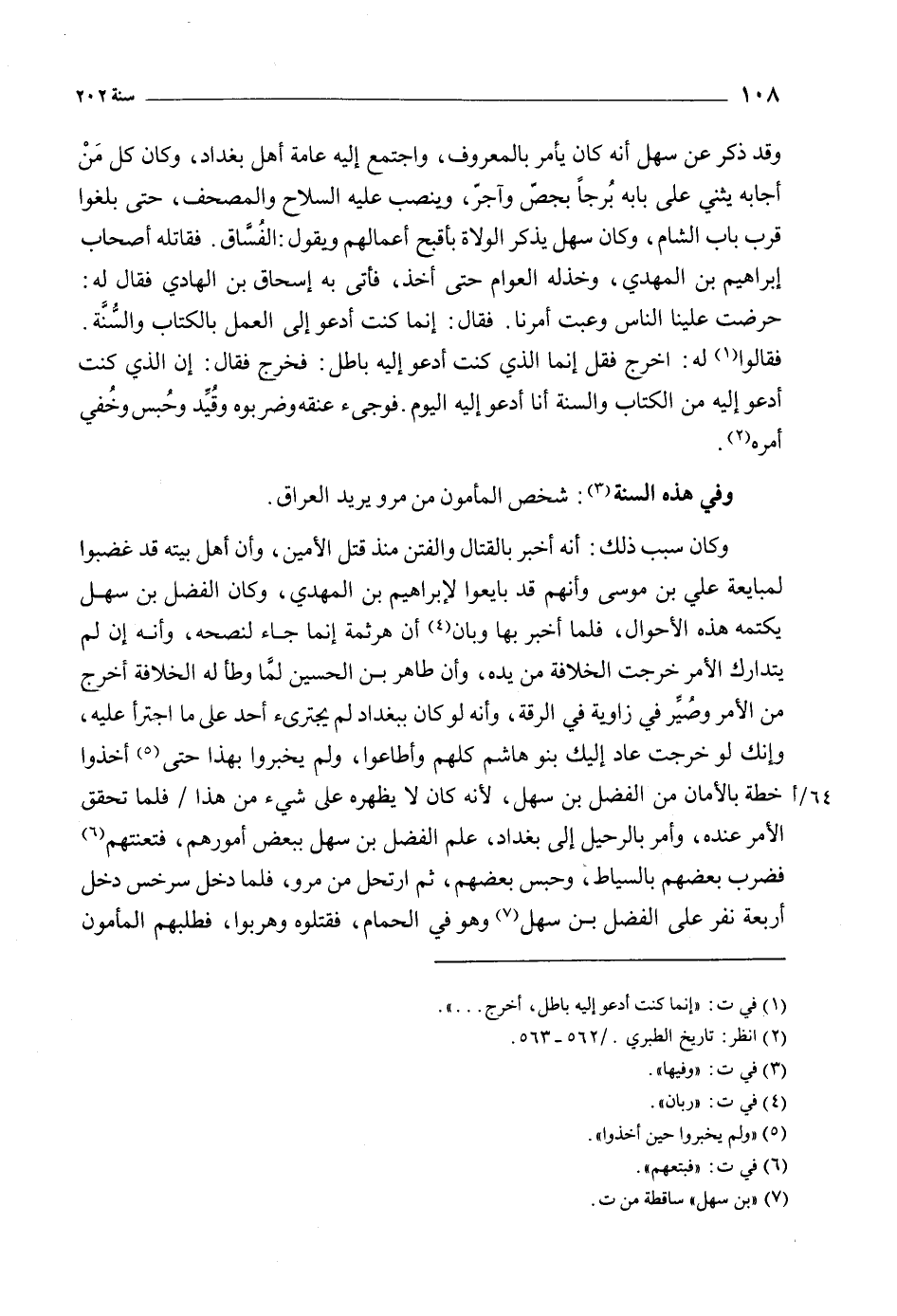 وكان سبب ذلك: أنه أخبر بالقتال والفتن منذ قتل الأمين، وأن أهل بيته قد غضبوا لمبايعة علي بن موسى وأنهم قد بايعوا لإبراهيم بن المهدي، وكان الفضل بن سهل يكتمه هذه الأحوال، فلما أخبر بها وبان [4] أن هرثمة إنما جاء لنصحه، وأنه إن لم يتدارك الأمر خرجت الخلافة من يده، وأن طاهر بن الحسين لما وطأ له الخلافة أخرج من الأمر وصير في زاوية في الرقة، وأنه لو كان ببغداد لم يجترئ أحد على ما اجترأ عليه، وإنك لو خرجت عاد إليك بنو هاشم كلهم وأطاعوا، ولم يخبروا بهذا حتى [5] أخذوا خطة بالأمان من الفضل بن سهل، لأنه كان لا يظهره على شيء من هذا/ فلما تحقق الأمر عنده، وأمر بالرحيل إلى بغداد، علم الفضل بن سهل ببعض أمورهم، فتعنتهم [6] فضرب بعضهم بالسياط، وحبس بعضهم، ثم ارتحل من مرو، فلما دخل سرخس دخل أربعة نفر على الفضل بن سهل [7] وهو في الحمام، فقتلوه وهربوا، فطلبهم المأمون