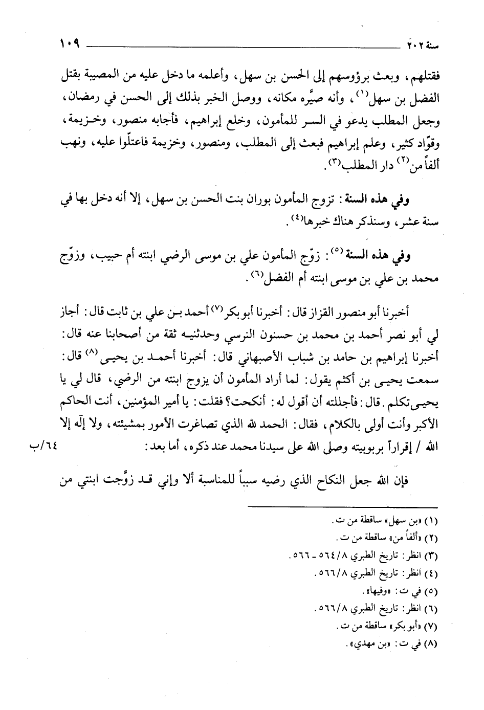 وفي هذه السنة: تزوج المأمون بوران بنت الحسن بن سهل، إلا أنه دخل بها في سنة عشر، وسنذكر هناك خبرها [4] .