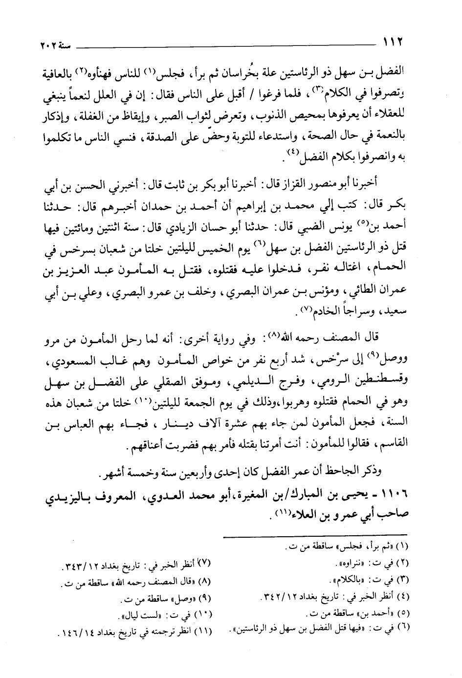أخبرنا أبو منصور القزاز قال: أخبرنا أبو بكر بن ثابت قَالَ: أخبرني الحسن بن أبي بَكْر قَالَ: كتب إلي محمد بن إبراهيم أن أحمد بن حمدان أخبرهم قَالَ: حدثنا أحمد بن [5] يونس الضَّبُّي قَالَ: حدثنا أبو حسان الزيادي قَالَ: سنة اثنتين ومائتين فيها قتل ذو الرئاستين الفضل بْن سهل [6] يوم الخميس لليلتين خلتا من شعبان بسرخس في الحمام، اغتاله نفر، فدخلوا عليه فقتلوه، فقتل به المأمون عبد العزيز بن عمران الطائي، ومؤنس بن عمران البصري، وخلف بن عمرو البصري، وعلي بن أبي سعيد، وسراجا الخادم [7] .