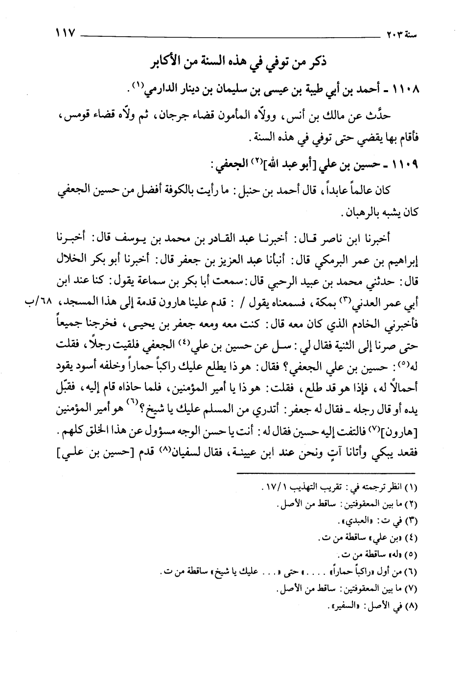 أخبرنا ابن ناصر قال: أخبرنا عبد القادر بْنُ مُحَمَّدِ بْنِ يُوسُفَ قَالَ: أَخْبَرَنَا إِبْرَاهِيم بْن عمر البرمكي قَالَ: أنبأنا عبد العزيز بن جعفر قَالَ: أخبرنا أبو بكر الخلال قَالَ: حدثني مُحَمَّد بن عبيد الرَّحبي قَالَ: سمعت أبا بكر بن سماعة يَقُولُ: كنا عند ابن أبي عمر العدني [3] بمكة، فسمعناه يَقُولُ/: قدم علينا هارون قدمة إلى هذا المسجد، فأخبرني الخادم الذي كان معه قَالَ: كنت معه ومعه جعفر بن يحيى، فخرجنا جميعا حتى صرنا إلى الثنية فقال لي: سل عَن حسين بن علي [4] الجعفي فلقيت رجلا، فقلت لَهُ [5] : حسين بن علي الجعفي؟ فَقَالَ: هو ذا يطلع عليك راكبا حمارا وخلفه أسود يقود أحمالا له، فإذا هو قد طلع، فقلت: هو ذا يا أمير المؤمنين، فلما حاذاه قام إليه، فقبل يده أو قال رجله- فقال له جعفر: أتدري من المسلم عليك يا شَيْخ؟ [6] هو أمير المؤمنين [هارون] [7] فالتفت إليه حسين فقال له: أنت يا حسن الوجه مسئول عن هذا الخلق كلهم.