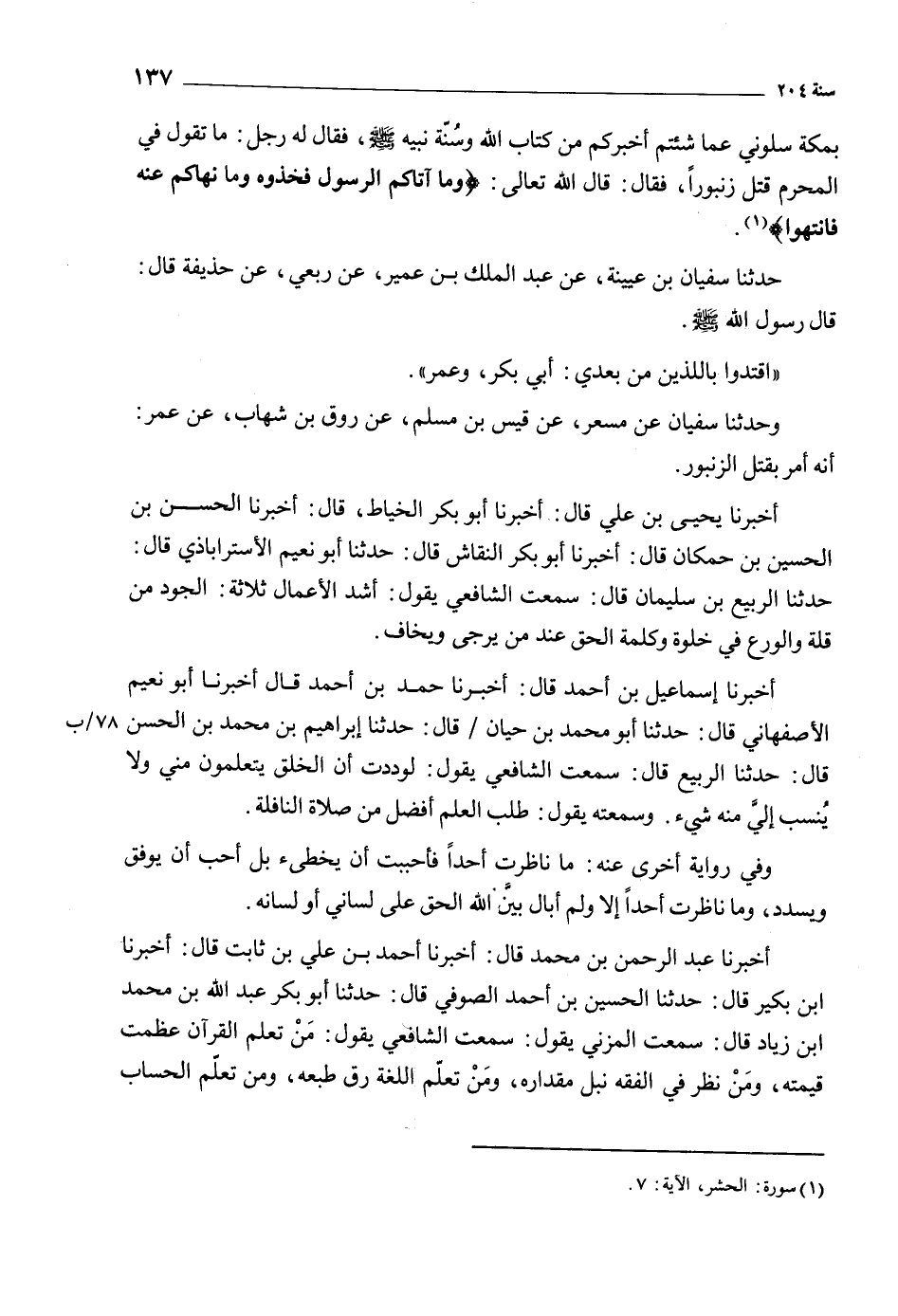 أخبرنا إسماعيل بن أحمد قال: أَخْبَرَنَا حَمَدُ بْنُ أَحْمَدَ قَالَ أَخْبَرَنَا أَبُو نعيم الأصفهاني قال: حدثنا أبو محمد بن حيان/ قال: حدثنا إبراهيم بن محمد بن الحسن قال: حدثنا الربيع قَالَ: سمعت الشافعي يَقُولُ: لوددت أن الخلق يتعلمون مني ولا ينسب إلي منه شيء. وسمعته يَقُولُ: طلب العلم أفضل من صلاة النافلة.