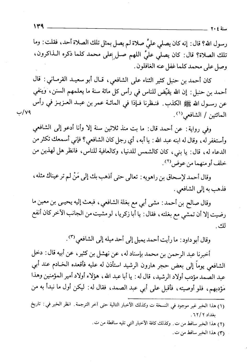وفي رواية: عن أحمد قَالَ: ما بت منذ ثلاثين سنة إلا وأنا أدعو إلى الشافعي وأستغفر لَهُ، وقال له ابنه عبد اللَّه: يا أبه، أي رجل كان الشافعي؟ فإني أسمعك تكثر من الدعاء لَهُ، قَالَ: يا بني، كان كالشمس للدنيا، وكالعافية للناس، فانظر هل لهذين من خلف أو منهما من عوض [2] .