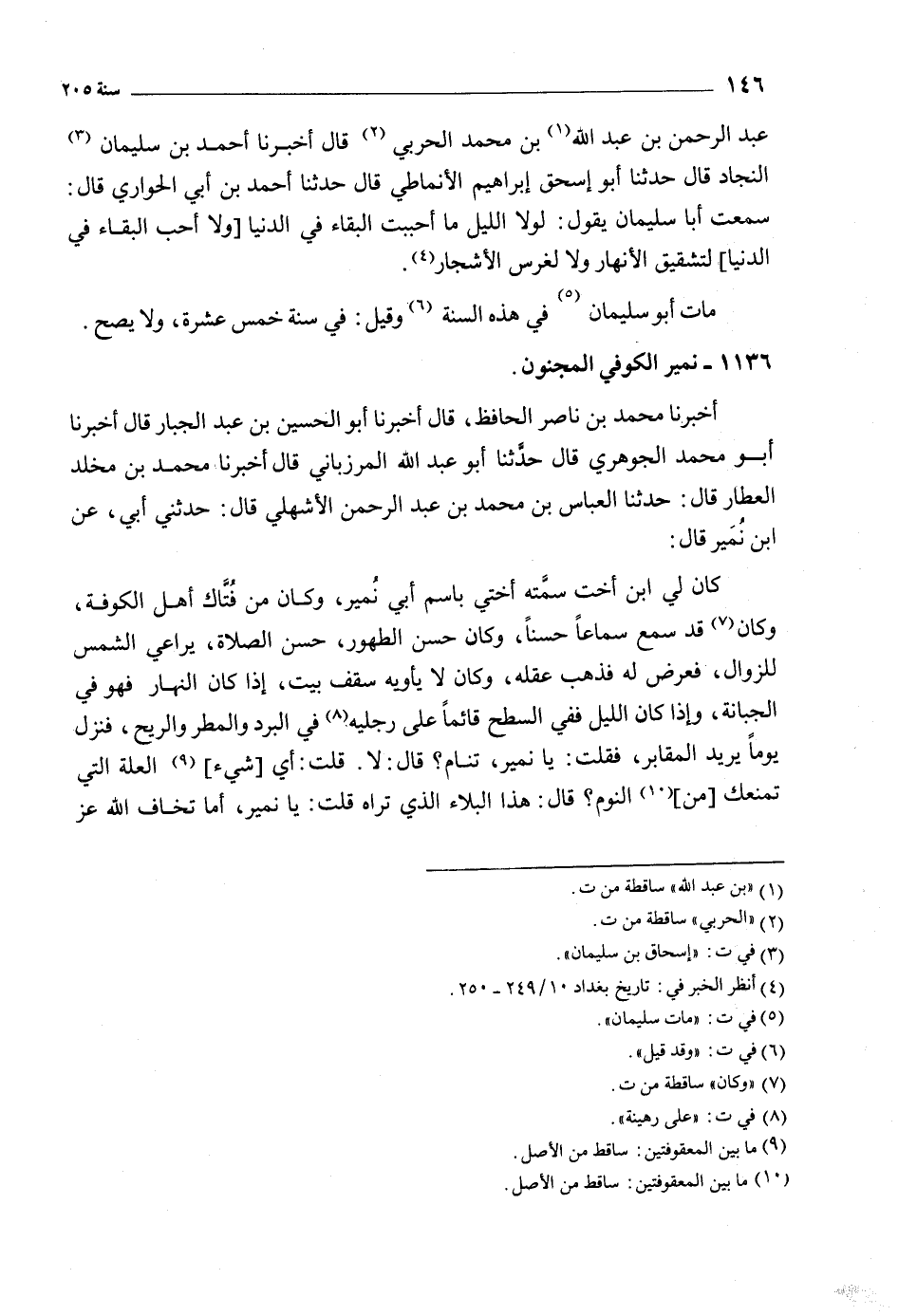 كان لي ابن أخت سمته أختي باسم أبي نمير، وكان من فتاك أهل الكوفة، وكان [7] قد سمع سماعا حسنا، وكان حسن الطهور، حسن الصلاة، يراعي الشمس للزوال، فعرض له فذهب عقله، وكان لا يأويه سقف بيت، إذا كان النهار فهو في الجبانة، وإذا كان الليل ففي السطح قائما على رجليه [8] في البرد والمطر والريح، فنزل يوما يريد المقابر، فقلت: يا نمير، تنام؟ قَالَ: لا. قلت: أي [شيء] [9] العلة التي تمنعك [من] [10] النوم؟ قَالَ: هذا البلاء الّذي تراه قلت: يا نمير، أما تخاف الله عز