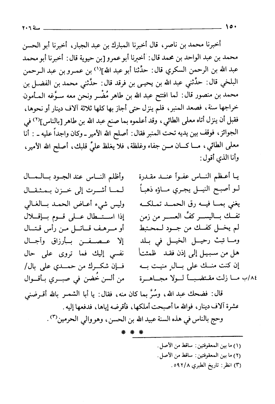 أخبرنا محمد بن ناصر، قال أخبرنا المبارك بن عبد الجبار، أخبرنا أبو الحسن محمد بن عبد الواحد بن محمد قال: أخبرنا أبو عمرو [بن حيوية قَالَ: أَخْبَرَنَا أَبُو مُحَمَّد عبد الله بْن الرحمن السُّكري قَالَ: حدثنا أبو عَبْد اللَّهِ] [1] بْن عَمْرو بْن عَبْد الرَّحْمَنِ البلخي قال: حَدَّثَني عبد الله بن يحيى بن فرقد قَالَ: حدثني محمد بن الفضل بن محمد بن منصور قَالَ: لما افتتح عَبْد اللَّه بن طاهر مضر ونحن معه سوغه المأمون خراجها سنة، فصعد المنبر، فلم ينزل حتى أجاز بها كلها ثلاثة آلاف دينار أو نحوها، فقبل أن ينزل أتاه معلى الطائي، وقد أعلموه بما صنع عبد الله بن طاهر [بالناس] [2] في الجوائز، فوقف بين يديه تحت المنبر فَقَالَ: أصلح الله الأمير- وكان واجدا عليه-: أنا معلى الطائي، ما كان من جفاء وغلظة، فلا يغلظ عَلَى قلبك، أصلح الله الأمير، وأنا الذي أقول: