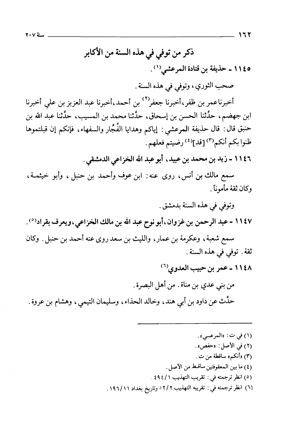 أخبرنا عمر بن ظفر، أخبرنا جعفر [2] بن أحمد، أخبرنا عبد العزيز بْن عَلي أَخْبَرَنَا ابن جهضم، حدثنا الحسن بن إسحاق، حدثنا محمد بن المسيّب، حدّثنا عبد الله بن حنبق قَالَ: قال حُذيْفة المرعشي: إياكم وهدايا الفجار والسفهاء، فإنكم إن قبلتموها ظنوا بكم أنكم [3] [قد] [4] رضيتم فعلهم.