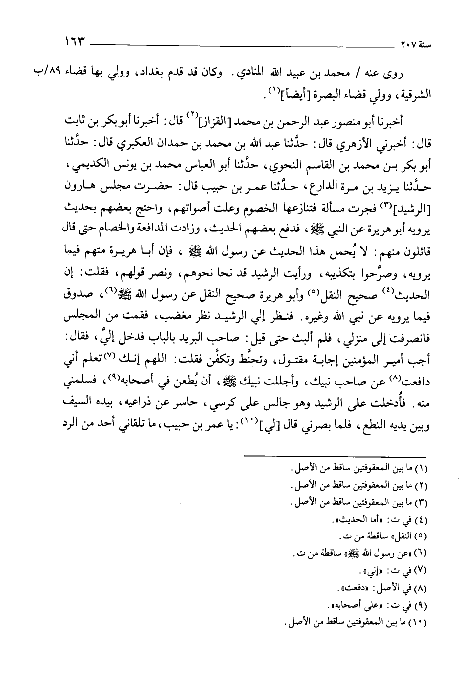 أخبرنا أبو منصور عبد الرحمن بن محمد [القزاز] [2] قَالَ: أَخْبَرَنَا أَبُو بَكْر بْن ثابت قَالَ: أخبرني الأزهري قال: حدثنا عبد الله بن محمد بن حمدان العكبري قَالَ: حَدَّثَنَا أَبُو بَكْرِ بْنُ مُحَمَّدِ بْنُ القاسم النَّحْوِي، حدثنا أبو العباس محمد بن يونس الكديمي، حدثنا يزيد بن مرة الدارع، حدثنا عمر بن حبيب قَالَ: حضرت مجلس هارون [الرشيد] [3] فجرت مسألة فتنازعها الخصوم وعلت أصواتهم، واحتج بعضهم بحديث يرويه أبو هُرَيْرَةَ عَنِ النَّبيّ صَلَّى اللَّهُ عَليْه وَسَلَّمَ، فدفع بعضهم الحديث، وزادت المدافعة والخصام حتى قال قائلون منهم: لا يحمل هذا الْحَدِيثَ عَنْ رَسُولِ اللَّهِ صَلَّى اللَّهُ عَلَيْهِ وسلم، فإن أبا هريرة متهم فيما يرويه، وصرحوا بتكذيبه، ورأيت الرشيد قد نحا نحوهم، ونصر قولهم، فقلت: إن الحديث [4] صحيح النقل [5] وأبو هريرة صحيح النقل عن رسول الله صلَّى اللَّه عَلَيْهِ وسلم [6] ، صدوق فيما يرويه عن نبي الله وغيره. فنظر إلي الرشيد نظر مغضب، فقمت من المجلس فانصرفت إلى منزلي، فلم ألبث حتى قيل: صاحب البريد بالباب فدخل إلي، فَقَالَ: