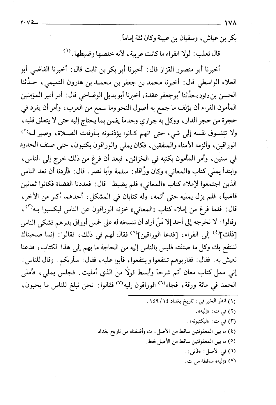 الوراقين، وألزمه الأمناء والمنفقين، فكان يملي والوراقون يكتبون، حتى صنف الحدود في سنين، وأمر المأمون بكتبه في الخزائن، فبعد أن فرغ من ذلك خرج إلى الناس، وابتدأ يملي كتاب «المعاني» وكان وراقاه: سلمة وأبا نصر. قال: فأردنا ابن نعد الناس الذين اجتمعوا لإملاء كتاب «المعاني» فلم يضبط. قَالَ: فعددنا القضاة فكانوا ثمانين قاضيا، فلم يزل يمليه حتى أتمه، وله كتابان في المشكل، أحدهما أكبر من الآخر، قَالَ: فلما فرغ من إملاء كتاب «المعاني» خزنه الوراقون عن الناس ليكسبوا بِهِ [3] ، وقالوا: لا نخرجه إلى أحد إلا من أراد أن ننسخه له على خمس أوراق بدرهم فشكى الناس [ذلك] [4] إلى الفراء، [فدعا الوراقين] [5] فَقَالَ لهم في ذلك، فقالوا: إنما صحبناك لننتفع بك وكل ما صنفته فليس بالناس إليه من الحاجة ما بهم إلى هذا الكتاب، فدعنا نعيش به. فَقَالَ: فقاربوهم تنتفعوا وتنتفعوا، فأبوا عليه، فقال: سأريكم. وقال للناس: