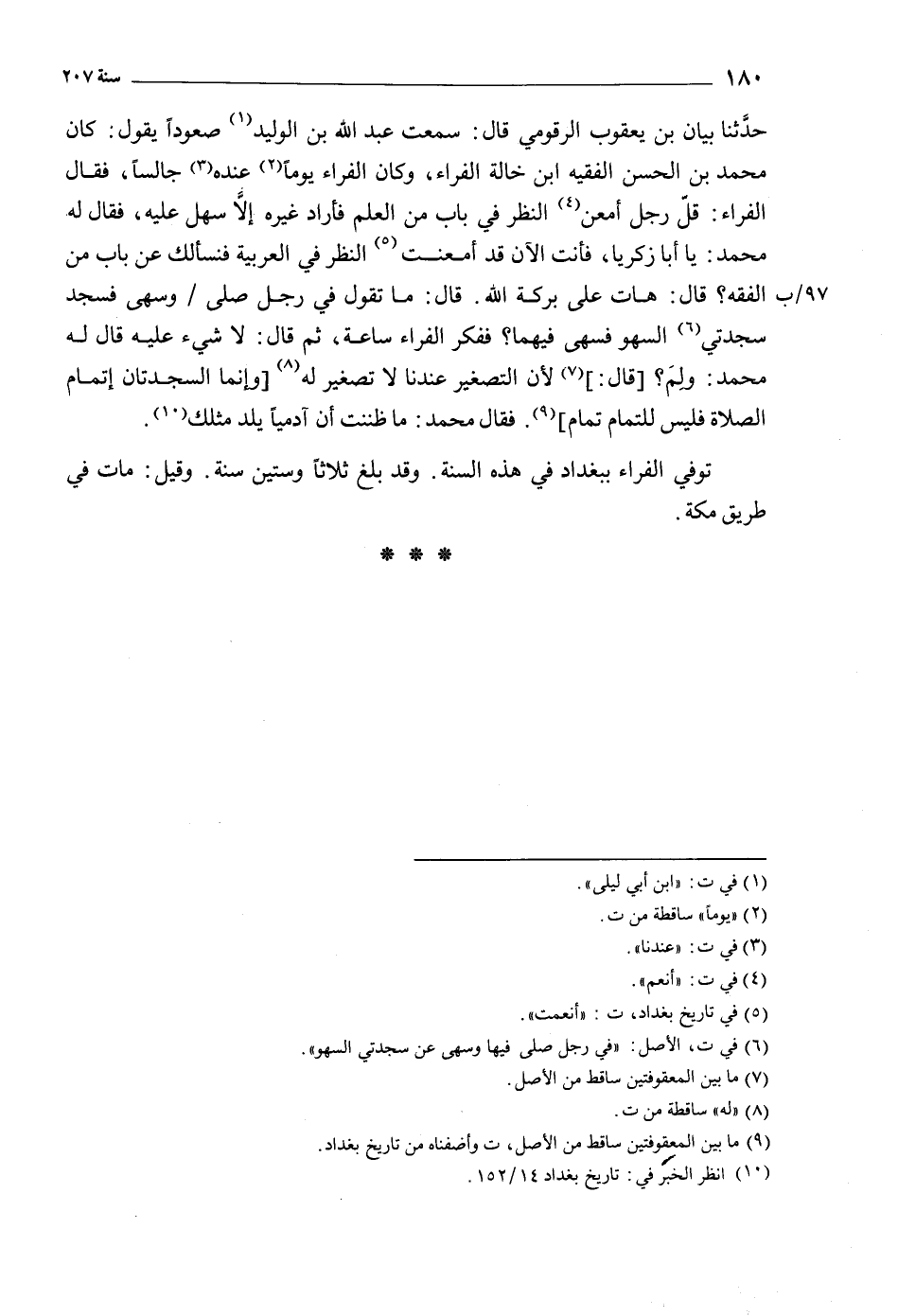 توفي الفراء ببغداد في هذه السنة. وقد بلغ ثلاثا وستين سنة. وقيل: مات في طريق مكة.