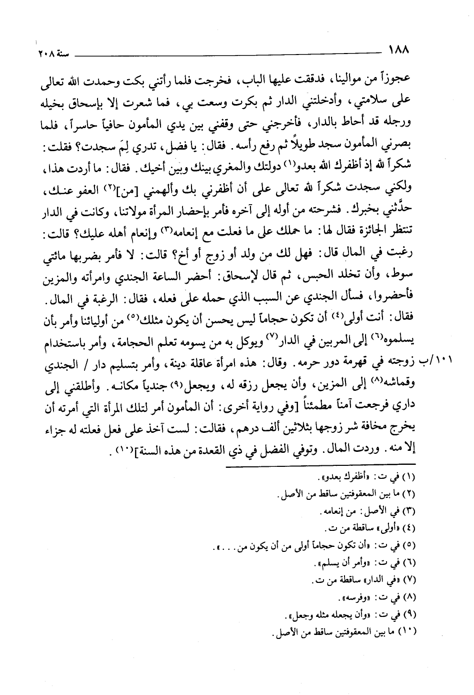 فَقَالَ: أنت أولى [4] أن تكون حجاما ليس يحسن أن يكون مثلك [5] من أوليائنا وأمر بأن يسلموه [6] إلى المربين في الدار [7] ويوكل به من يسومه تعلم الحجامة، وأمر باستخدام زوجته في قهرمة دور حرمه. وقَالَ: هذه امرأة عاقلة دينة، وأمر بتسليم دار/ الجندي وقماشه [8] إلى المزين، وأن يجعل رزقه لَهُ، ويجعل [9] جنديا مكانه. وأطلقني إلى داري فرجعت آمنا مطمئنا [وفي رواية أخرى: أن المأمون أمر لتلك المرأة التي أمرته أن يخرج مخافة شر زوجها بثلاثين ألف درهم، فقالت: لست آخذ على فعل فعلته له جزاء إلا منه. وردت المال. وتوفي الفضل في ذي القعدة من هذه السنة] [10] .