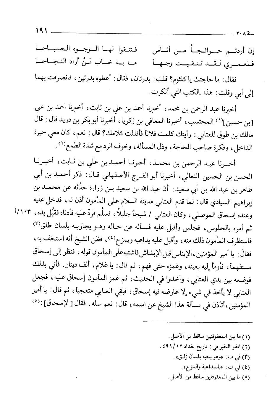 أَخْبَرَنَا عَبْدُ الرَّحْمَنِ بْنُ مُحَمَّدٍ، أَخْبَرَنَا أَحْمَدُ بْنُ عَلِيِّ بْنِ ثَابِتٍ، أَخْبَرَنَا الْحَسَنُ بْنُ الحُسَين النعالي، أخبرنا أبو الفرج الأصفهاني قَالَ: ذكر أحمد بن أبي طاهر بن عبد الله بن أَبِي سَعِيد: أن عبد الله بن سعيد بن زرارة حدثه عن محمد بن إبراهيم السيادي قَالَ: لما قدم العتابي مدينة السلام على المأمون أذن لَهُ، فدخل عليه وعنده إسحاق الموصلي، وكان العتابي/ شيخا جليلا، فسلم فرد عليه فأدناه فقبل يده، ثم أمره بالجلوس، فجلس وأقبل عَلَيْهِ فسأله عن حاله وهو يجاوبه بلسان طلق [3] فاستظرف المأمون ذلك منه، وأقبل عليه يداعبه ويمزح [4] ، فظن الشيخ أنه استخف به، فقال: يا أمير المؤمنين، الإيناس قبل الإبشاش فاشتبه على المأمون قوله، فنظر إلى إسحاق مستفهما، فأومأ إليه بعينه، وغمزه حتى فهم، ثم قال: يا غلام، ألف دينار. فأتي بذلك فوضعه بين يدي العتابي، وأخذوا في الحديث، ثم غمز المأمون إسحاق عليه، فجعل العتابي لا يأخذ في شيء إلا عارضه فيه إسحاق، فبقي العتابي متعجبا، ثم قَالَ: يا أمير المؤمنين، أتأذن في مسألة هذا الشيخ عن اسمه، قال: نعم سله. فقال [لإسحاق] : [5]