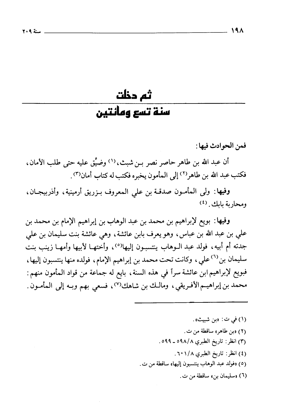 وفيها: ولى المأمون صدقة بن علي المعروف بزريق أرمينية، وأذربيجان، ومحاربة بابك. [4] وفيها: بويع لإبراهيم بن محمد بن عبد الوهاب بن إبراهيم الإمام بن مُحَمَّدُ بْنُ عَلِيِّ بْنِ عَبْدِ اللَّهِ بْنِ عباس، وهو يعرف بابن عائشة، وهي عائشة بنت سليمان بن علي جدته أم أبيه، فولد عبد الوهاب ينتسبون إليها [5] ، وأختها لأبيها وأمها زينب بنت سليمان بن [6] علي، وكانت تحت محمد بن إبراهيم الإمام، فولده منها ينتسبون إليها، فبويع لإبراهيم ابن عائشة سرا في هذه السنة، بايع له جماعة من قواد المأمون منهم: