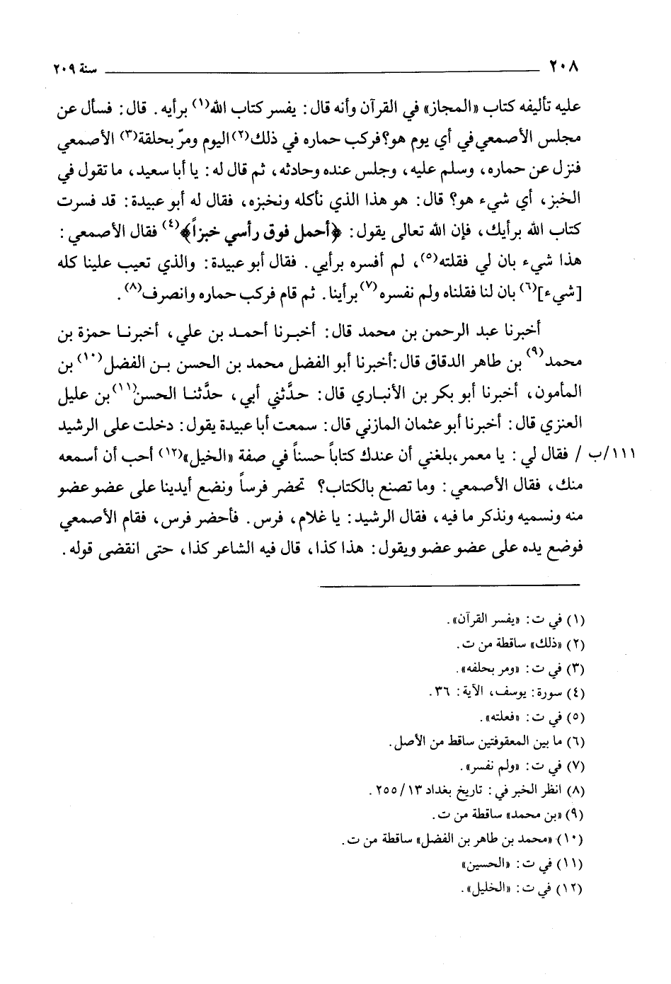 أخبرنا عبد الرحمن بن محمد قال: أخبرنا أحمد بن علي، أخبرنا حمزة بْن مُحَمَّد [9] بْن طاهر الدقاق قَالَ: أخبرنا أبو الفضل محمد بن الحسن بن الفضل [10] بن المأمون، أخبرنا أبو بكر بْن الأنباري قَالَ: حَدَّثَني أبي، حدثنا الحسن [11] بن عليل العنزي قَالَ: أخبرنا أبو عثمان المازني قال: سمعت أبا عبيدة يقول: دخلت على الرشيد/ فقال لي: يا معمر، بلغني أن عندك كتابا حسنًا في صفة «الخيل» [12] أحب أن أسمعه منك، فقال الأصمعي: وما تصنع بالكتاب؟ تحضر فرسا ونضع أيدينا على عضو عضو منه ونسميه ونذكر ما فيه، فقال الرشيد: يا غلام، فرس. فأحضر فرس، فقام الأصمعي فوضع يده على عضو عضو ويقول: هذا كذا، قال فيه الشاعر كذا، حتى انقضى قوله.