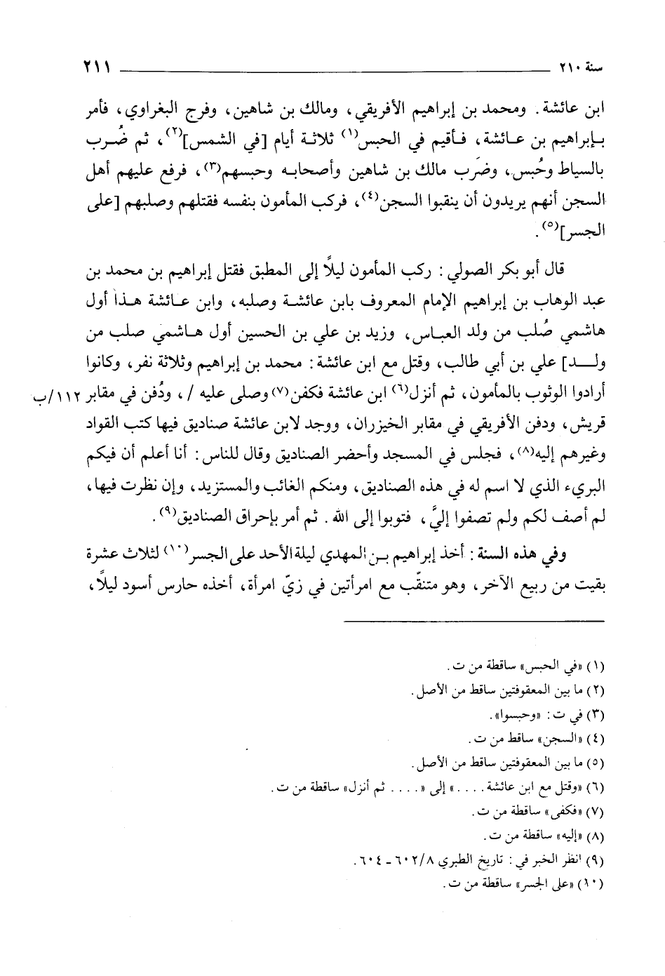ابن عائشة. ومحمد بن إبراهيم الإفريقي، ومالك بن شاهين، وفرج البغراوي، فأمر بإبراهيم بن عائشة، فأقيم في الحبس [1] ثلاثة أيام [في الشمس] [2] ، ثم ضرب بالسياط وحبس، وضرب مالك بْن شاهين وأصحابه وحبسهم [3] ، فرفع عليهم أهل السجن أنهم يريدون أن ينقبوا السجن [4] ، فركب المأمون بنفسه فقتلهم وصلبهم [على الجسر] [5] .