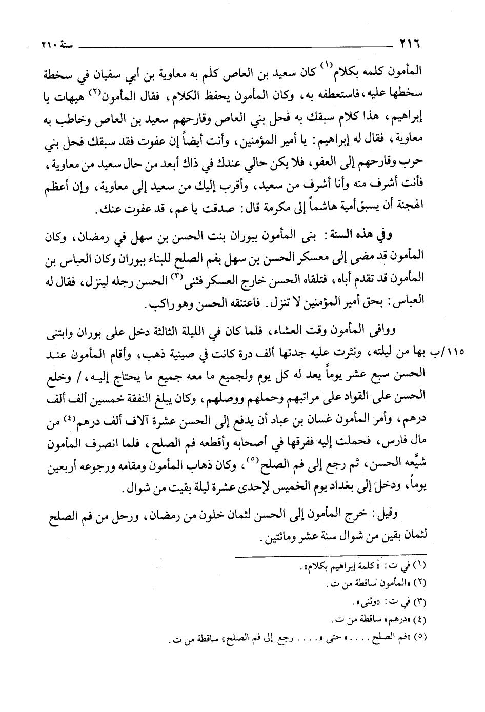 وفي هذه السنة: بنى المأمون ببوران بنت الحسن بن سهل في رمضان، وكان المأمون قد مضى إلى معسكر الحسن بن سهل بفم الصلح للبناء ببوران وكان العباس بن المأمون قد تقدم أباه، فتلقاه الحسن خارج العسكر فثنى [3] الحسن رجله لينزل، فقال له الْعَبَّاس: بحق أمير المؤمنين لا تنزل. فاعتنقه الحسن وهو راكب.