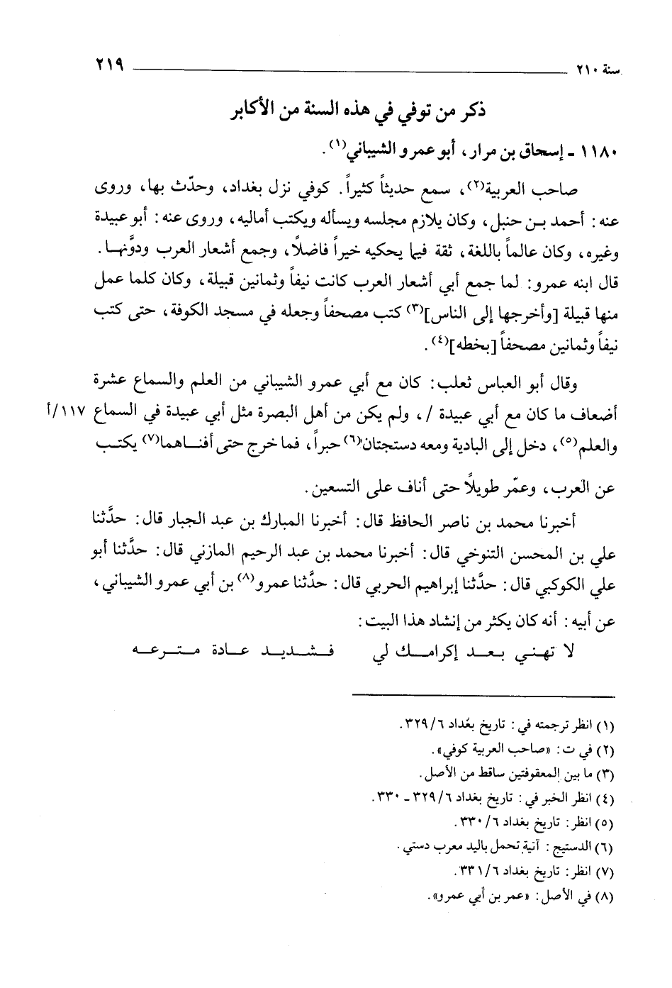 أخبرنا محمد بن ناصر الحافظ قال: أخبرنا المبارك بن عبد الجبار قَالَ: حدثنا علي بْن المحسن التنوخي قَالَ: أَخْبَرَنَا مُحَمَّد بْن عبد الرحيم المازني قَالَ: حدثنا أبو علي الكوكبي قَالَ: حدثنا إبراهيم الحربي قَالَ: حدثنا عمرو [8] بن أبي عمرو الشيبانيّ، عن أبيه: أنه كان يكثر من إنشاد هذا البيت: