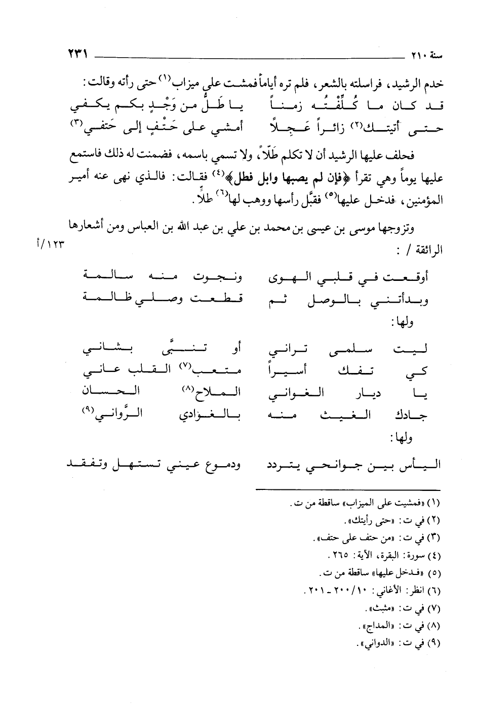 فحلف عليها الرشيد أن لا تكلم طلا، ولا تسمي باسمه، فضمنت له ذلك فاستمع عليها يوما وهي تقرأ فَإِنْ لَمْ يُصِبْها وابِلٌ فَطَلٌّ 2: 265 [4] فقالت: فالذي نهى عنه أمير المؤمنين، فدخل عليها [5] فقبل رأسها ووهب لها [6] طلا.
