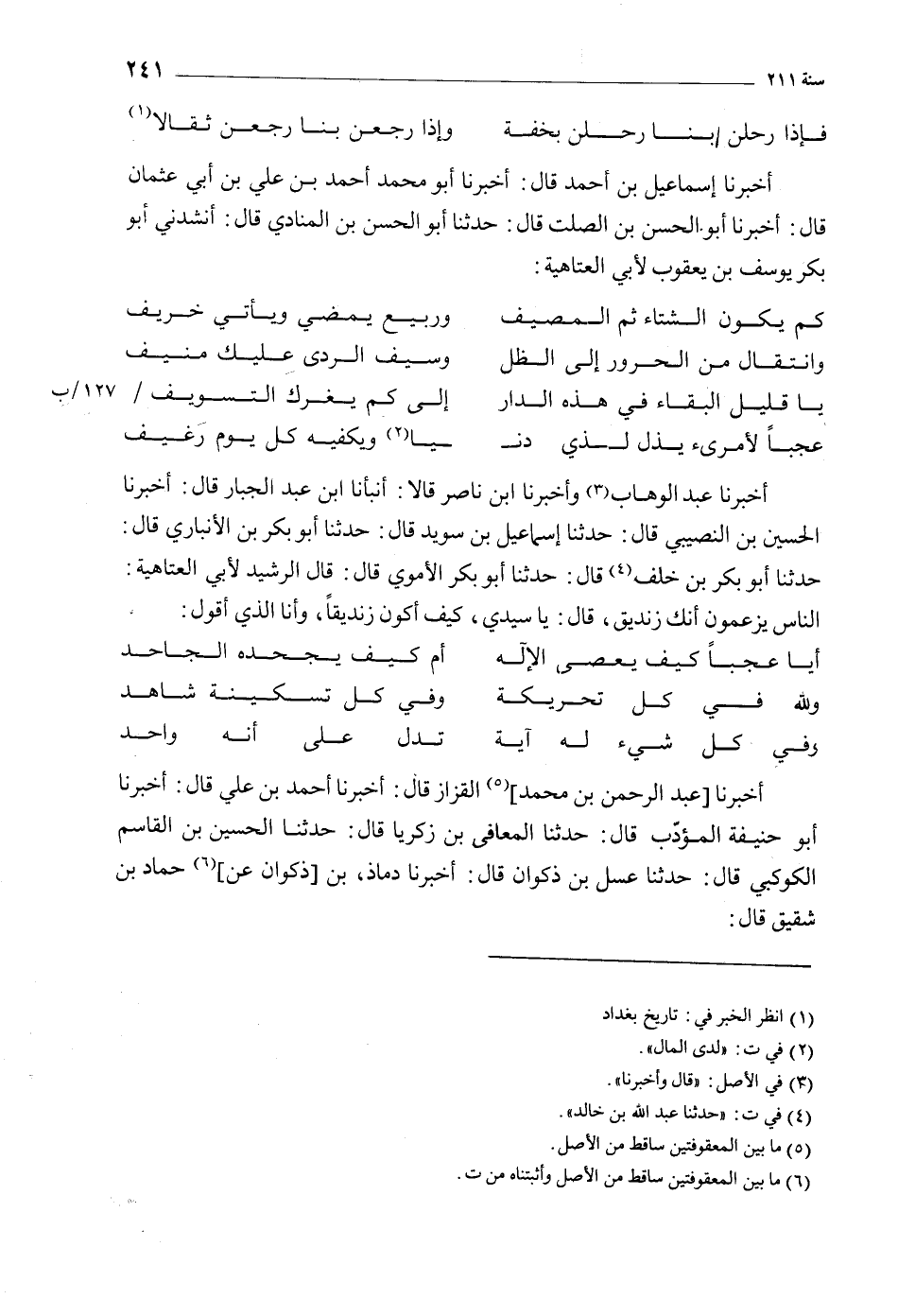 حدثنا أَبُو بكر بْن خلف [4] قَالَ: حَدَّثَنَا أَبُو بكر الأموي قال: قال الرشيد لأبي العتاهية: