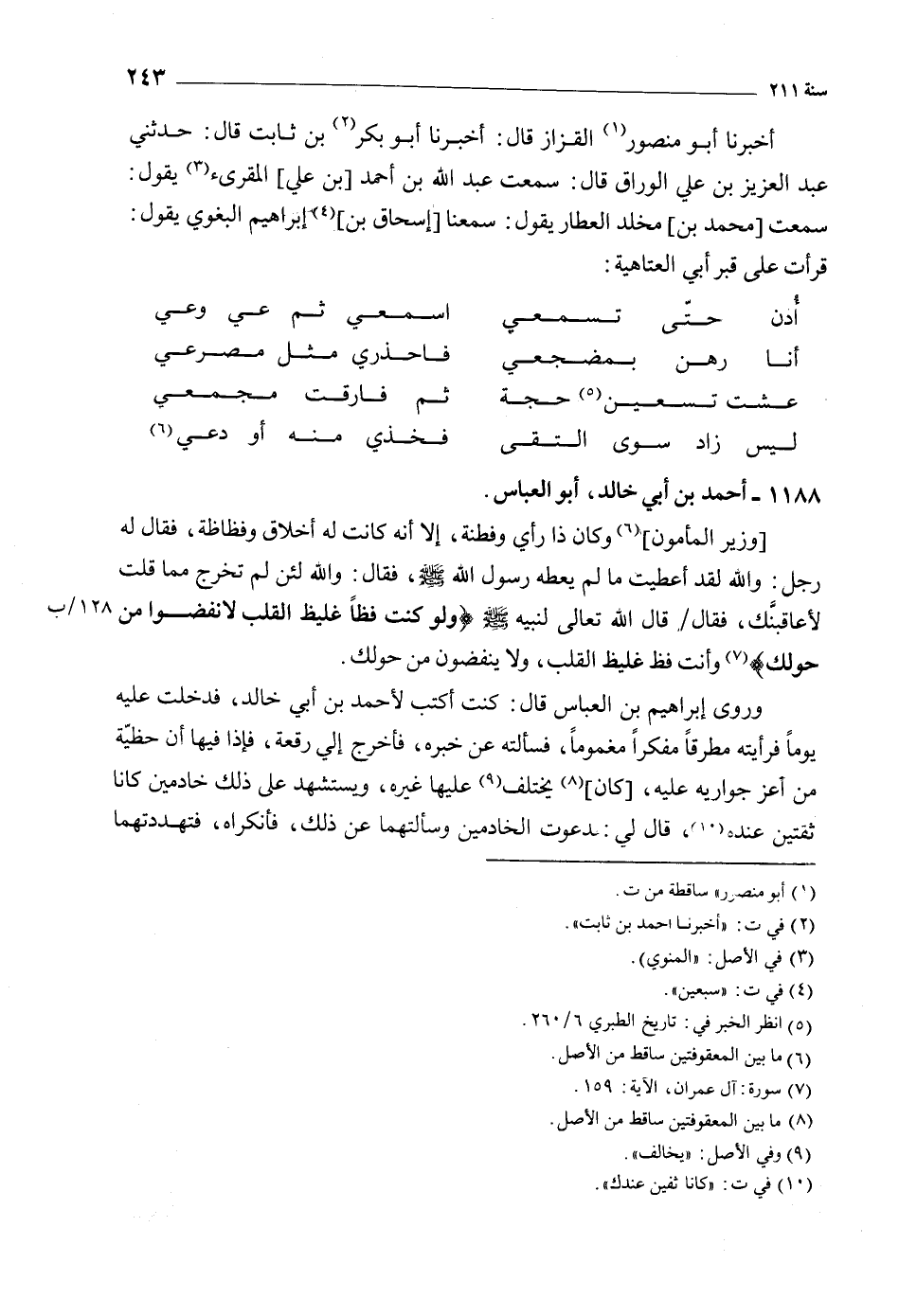 أخبرنا أبو منصور [1] القزاز قال: أخبرنا أبو بكر [2] بْنِ ثَابِتٍ قَالَ: حدثني عبد العزيز بْن علي الوراق قال: سمعت عبد الله بن أحمد [بن علي] المقرئ [3] يقول: