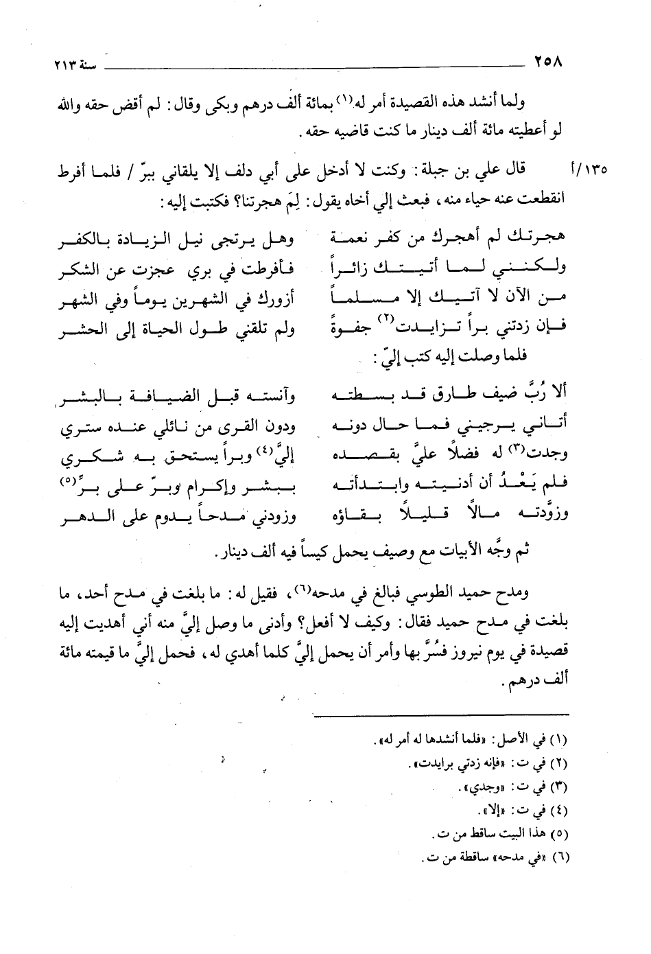 ولما أنشد هذه القصيدة أمر له [1] بمائة ألف درهم وبكى وقال: لم أقض حقه والله لو أعطيته مائة ألف دينار ما كنت قاضيه حقه.