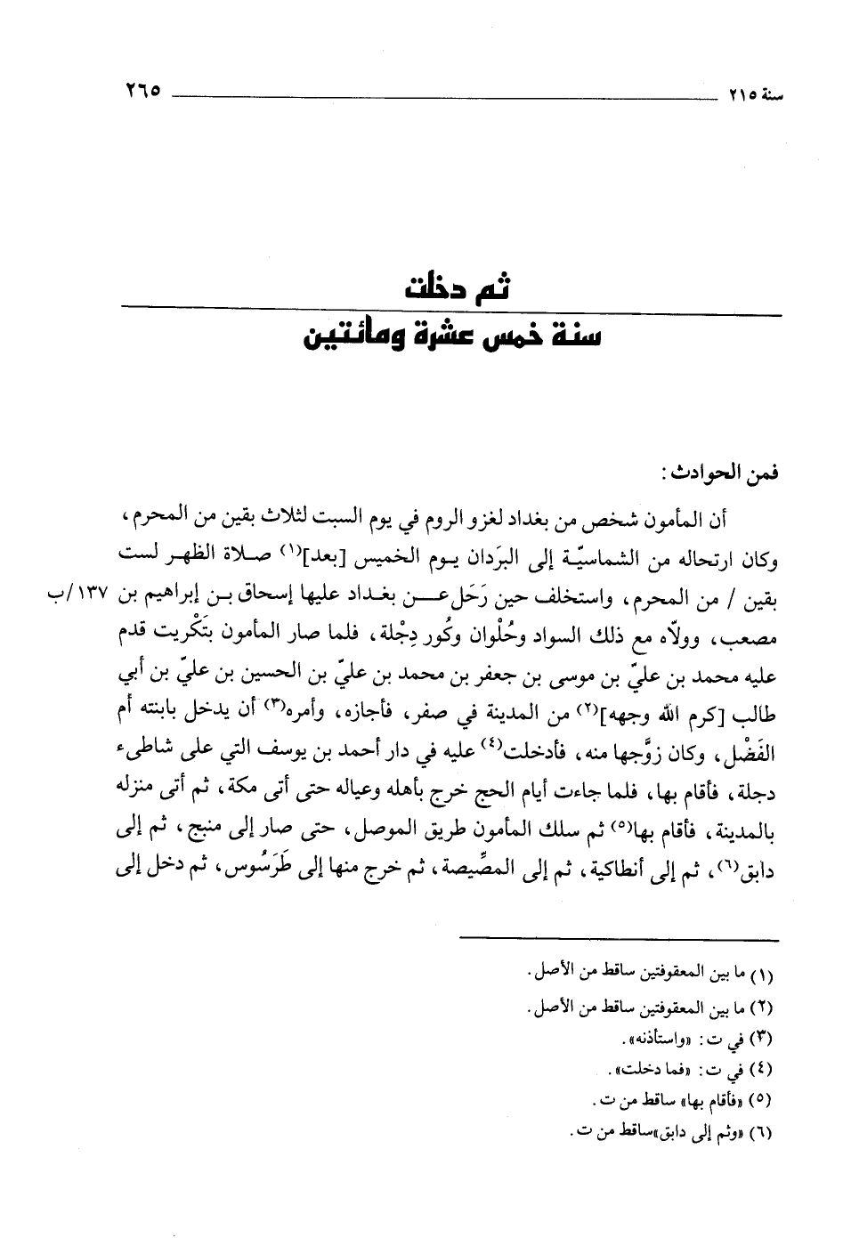 أن المأمون شخص من بغداد لغزو الروم في يوم السبت لثلاث بقين من المحرم، وكان ارتحاله من الشماسية إلى البردان يوم الخميس [بعد] [1] صلاة الظهر لست بقين/ من المحرم، واستخلف حين رحل عن بغداد عليها إسحاق بن إبراهيم بن مصعب، وولاه مع ذلك السواد وحلوان وكور دجلة، فلما صار المأمون بتكريت قدم عليه محمد بن علي بن موسى بن جعفر بن محمد بن علي بن الحسين بن علي بن أبي طالب [كرم الله وجهه] [2] من المدينة في صفر، فأجازه، وأمره [3] أن يدخل بابنته أم الفضل، وكان زوجها منه، فأدخلت [4] عليه في دار أحمد بن يوسف التي على شاطئ دجلة، فأقام بها، فلما جاءت أيام الحج خرج بأهله وعياله حتى أتى مكة، ثم أتى منزله بالمدينة، فأقام بها [5] ثم سلك المأمون طريق الموصل، حتى صار إلى منبج، ثم إلى دابق [6] ، ثم إلى أنطاكية، ثم إلى المصيصة، ثم خرج منها إلى طرسوس، ثم دخل إلى