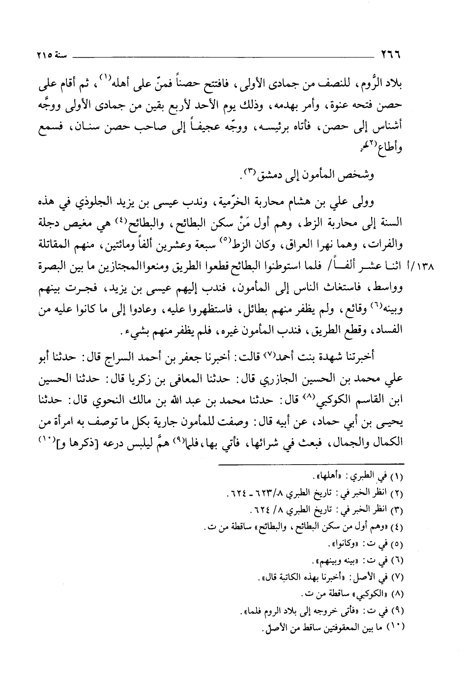 وولى علي بن هشام محاربة الخرمية، وندب عيسى بن يزيد الجلوذي في هذه السنة إلى محاربة الزط، وهم أول من سكن البطائح، والبطائح [4] هي مغيص دجلة والفرات، وهما نهرا العراق، وكان الزط [5] سبعة وعشرين ألفا ومائتين، منهم المقاتلة اثنا عشر ألفا/ فلما استوطنوا البطائح قطعوا الطريق ومنعوا المجتازين ما بين البصرة وواسط، فاستغاث الناس إلى المأمون، فندب إليهم عيسى بن يزيد، فجرت بينهم وبينه [6] وقائع، ولم يظفر منهم بطائل، فاستظهروا عليه، وعادوا إلى ما كانوا عليه من الفساد، وقطع الطريق، فندب المأمون غيره، فلم يظفر منهم بشيء.