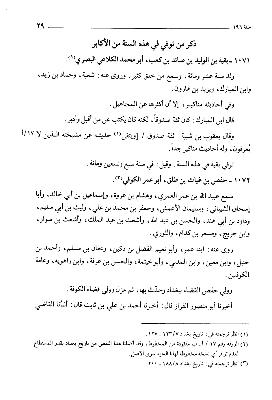 [2] الورقة رقم 17/ أ- ب مفقودة من المخطوط، وقد أكملنا هذا النقص من تاريخ بغداد بقدر المستطاع لعدم توافر أي نسخة مخطوطة لهذا الجزء سوى الأصل.