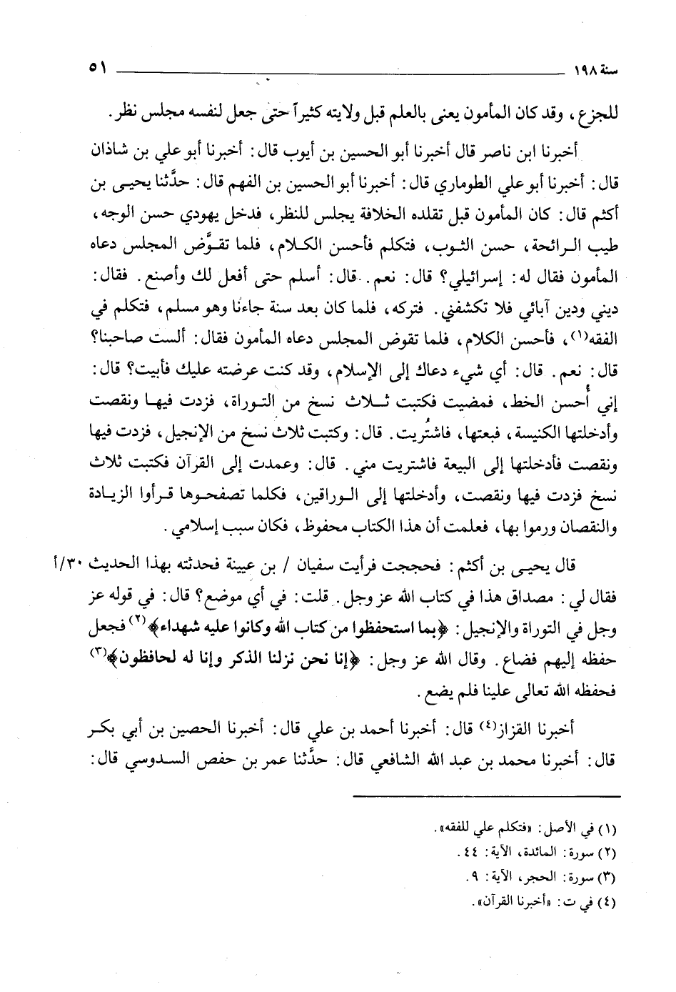 قال يحيى بن أكثم: فحججت فرأيت سفيان/ بن عيينة فحدثته بهذا الحديث فقال لي: مصداق هذا في كتاب الله عز وجل. قُلْتُ: في أي موضع؟ قَالَ: في قوله عز وجل في التوراة والإنجيل: بِمَا اسْتُحْفِظُوا من كِتابِ الله وَكانُوا عَلَيْهِ شُهَداءَ 5: 44 [2] فجعل حفظه إليهم فضاع. وقال الله عز وجل: إِنَّا نَحْنُ نَزَّلْنَا الذِّكْرَ وَإِنَّا لَهُ لَحافِظُونَ 15: 9 [3] .