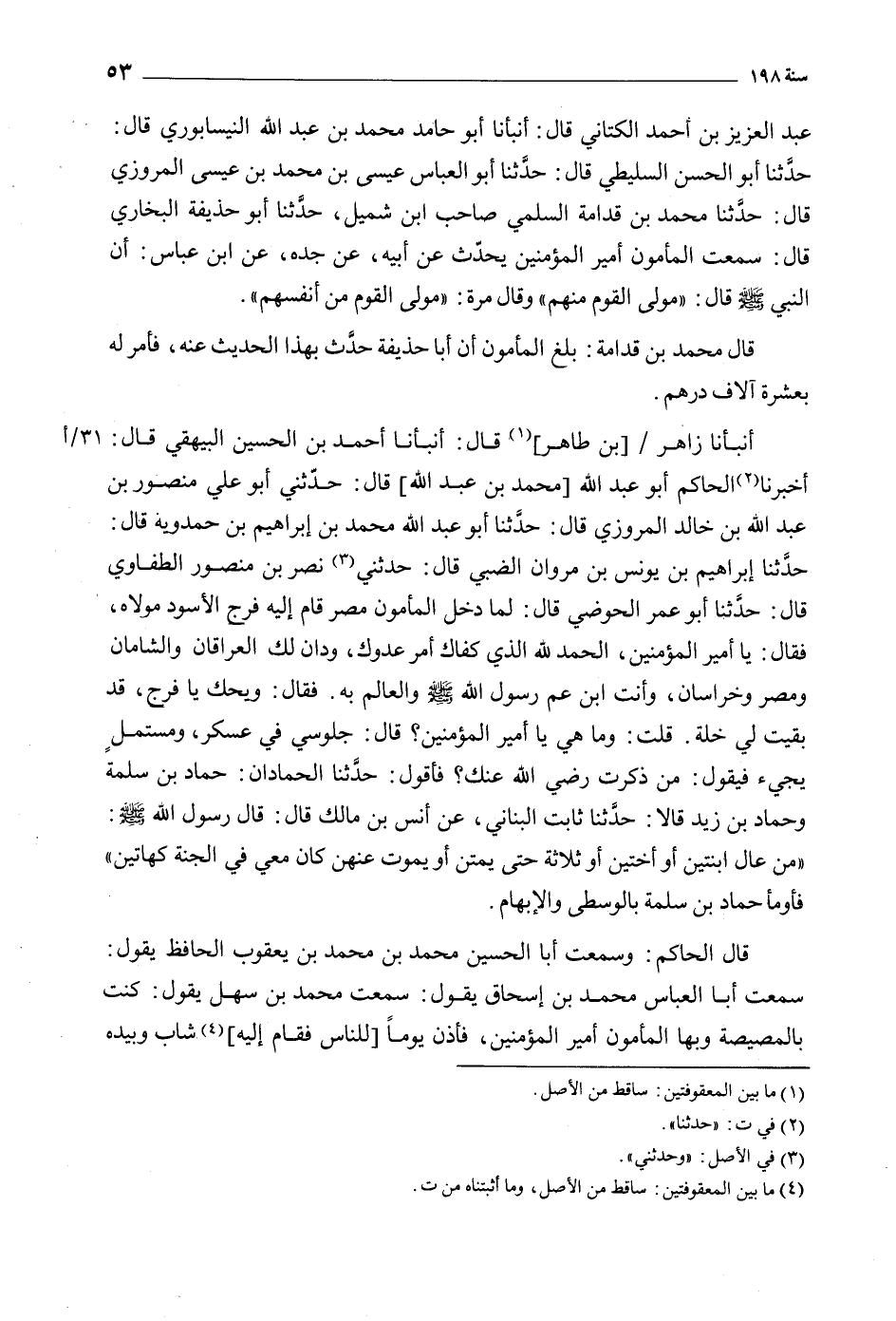 حدثنا إبراهيم بن يونس بن مروان الضبي قَالَ: حدثني [3] نصر بن منصور الطفاوي قَالَ: حدثنا أبو عمر الحوضي قال: لما دخل المأمون مصر قام إليه فرج الأسود مولاه، فَقَالَ: يا أمير المؤمنين، الحمد للَّه الذي كفاك أمر عدوك، ودان لك العراقان والشامان ومصر وخراسان، وأنت ابن عم رسول الله صلَّى اللَّه عَلَيْهِ وسلم والعالم به. فَقَالَ: ويحك يا فرج، قد بقيت لي خلة. قلت: وما هي يا أمير المؤمنين؟ قَالَ: جلوسي في عسكر، ومستمل يجيء فيقول: من ذكرت رضي الله عنك؟ فأقول: حَدَّثَنَا الْحَمَّادَانِ: حَمَّادُ بْنُ سَلَمَةَ وَحَمَّادُ بْنُ زَيْدٍ قَالا: حَدَّثَنَا ثَابِتٌ الْبُنَانِيُّ، عَنْ أَنَسِ بْنِ مَالِكٍ قَالَ: قَالَ رَسُولُ اللَّهِ صَلَّى اللَّهُ عَلَيْهِ وسلّم: «من عال ابنتين أَوْ أُخْتَيْنِ أَوْ ثَلاثَةً حَتَّى يَمُتْنَ أَوْ يَمُوتَ عَنْهُنَّ كَانَ مَعِي فِي الْجَنَّةِ كَهَاتَيْنِ» فَأَوْمَأَ حَمَّادُ بْنُ سَلَمَةَ بِالْوُسْطَى وَالإِبْهَامِ.