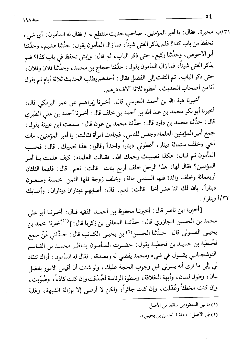 [أخبرنا ابن ناصر قَالَ: أَخْبَرَنَا محفوظ بْن أحمد الفقيه قَالَ: أَخْبَرَنَا أَبُو عَلي مُحَمَّد بْن الحسين الجازري قَالَ: حَدَّثَنَا المعافى بْن زكريّا قَالَ:] [1] أَخْبَرَنَا محمد بن يحيى الصولي قال: حدثنا الحسين [2] بن يحيى الكاتب قَالَ: حدثني من سمع قحطبة بن حميد بن قحطبة يَقُولُ: حضرت المأمون يناظر محمد بن القاسم النوشجاني يقول في شيء ومحمد يفضي له ويصدقه. فقال له المأمون: أراك تنقاد لي إلى ما ترى أنه يسرني قبل وجوب الحجة عليك، ولو شئت أن أقيس الأمور بفضل بيان، وطول لسان، وأبهة الخلافة، وسطوة الرئاسة لصدقت وإن كنت كاذبا، وصوبت، وإن كنت مخطئا وعدلت، وإن كنت جائرا، ولكن لا أرضى إلا بإزالة الشبهة، وغلبة