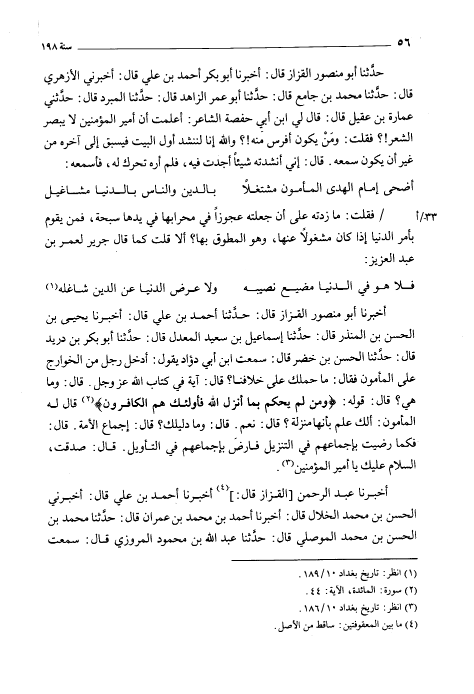 أخبرنا أبو منصور القزاز قال: حدثنا أحمد بن علي قال: أخبرنا يحيى بن الحَسَن بْن المنذر قَالَ: حدثنا إسماعيل بن سعيد المعدل قَالَ: حدثنا أبو بكر بن دريد قَالَ: حَدَّثَنَا الحسن بن خضر قَالَ: سمعت ابن أبي دؤاد يقول: أدخل رجل من الخوارج على المأمون فَقَالَ: ما حملك على خلافنا؟ قَالَ: آية في كتاب الله عز وجل. قَالَ: وما هِيَ؟ قَالَ: قوله: وَمن لَمْ يَحْكُمْ بِما أَنْزَلَ اللَّهُ فَأُولئِكَ هُمُ الْكافِرُونَ 5: 44 [2] قال له المأمون: ألك علم بأنها منزلة؟ قال: نعم. قال: وما دليلك؟ قَالَ: إجماع الأمة. قَالَ: