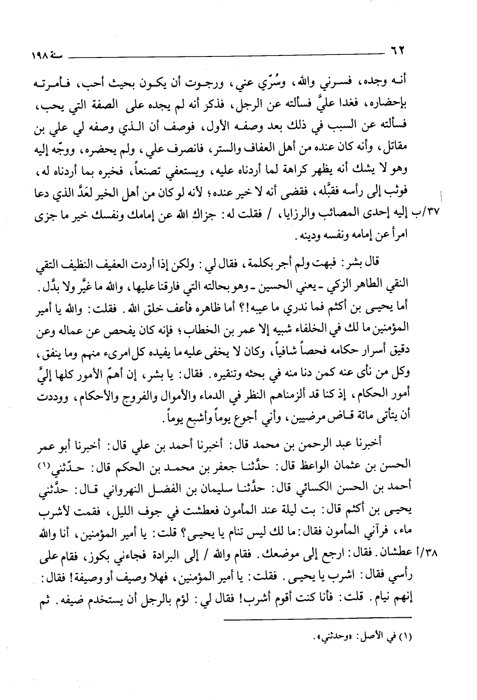 أنّهُ وجده، فسرني والله، وسري عني، ورجوت أن يكون بحيث أحب، فأمرته بإحضاره، فغدا علي فسألته عن الرجل، فذكر أنه لم يجده على الصفة التي يحب، فسألته عن السبب في ذلك بعد وصفه الأول، فوصف أن الذي وصفه لي علي بن مقاتل، وأنه كان عنده من أهل العفاف والستر، فانصرف علي، ولم يحضره، ووجه إليه وهو لا يشك أنه يظهر كراهة لما أردناه عليه، ويستعفي تصنعا، فخبره بما أردناه له، فوثب إلى رأسه فقبله، فقضى أنه لا خير عنده، لأنه لو كان من أهل الخير لعد الذي دعا إليه إحدى المصائب والرزايا، / فقلت لَهُ: جزاك اللَّه عن إمامك ونفسك خير ما جزى امرأ عن إمامه ونفسه ودينه.