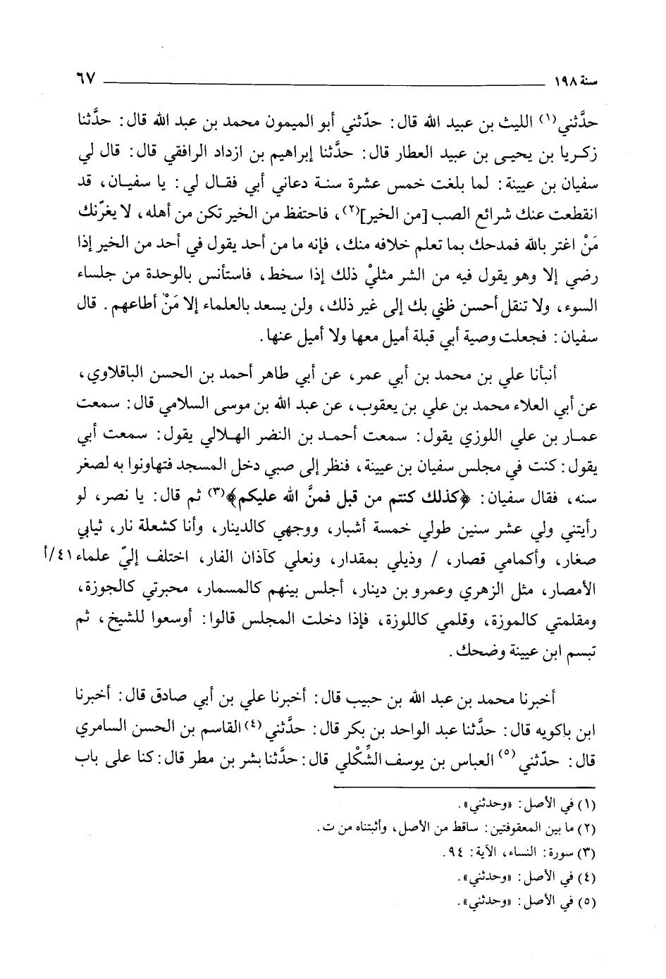 أنبأنا علي بن محمد بن أبي عمر، عن أبي طاهر أحمد بن الحسن الباقلاوي، عن أبي العلاء محمد بن علي بن يعقوب، عن عبد الله بن موسى السلامي قَالَ: سمعت عمار بن علي اللوزي يَقُولُ: سمعت أحمد بن النضر الهلالي يَقُولُ: سمعت أبي يَقُولُ: كنت في مجلس سفيان بْن عيينة، فنظر إلى صبي دخل المسجد فتهاونوا به لصغر سنه، فقال سُفْيان: كَذلِكَ كُنْتُمْ من قَبْلُ فَمَنَّ الله عَلَيْكُمْ 4: 94 [3] ثم قال: يا نصر، لو رأيتني ولي عشر سنين طولي خمسة أشبار، ووجهي كالدينار، وأنا كشعلة نار، ثيابي صغار، وأكمامي قصار، / وذيلي بمقدار، ونعلي كآذان الفار، أختلف إلي علماء الأمصار، مثل الزهري وعمرو بن دينار، أجلس بينهم كالمسمار، محبرتي كالجوزة، ومقلمتي كالموزة، وقلمي كاللوزة، فإذا دخلت المجلس قالوا: أوسعوا للشيخ، ثم تبسم ابن عيينة وضحك.