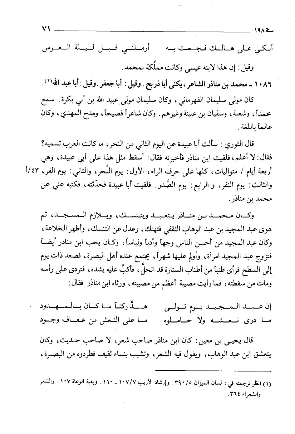 1086- محمد بن مناذر الشاعر، يكنى أبا ذريح. وقيل: أبا جعفر. وقيل: أبا عبد اللَّه