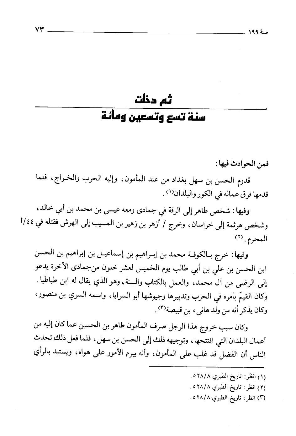 وفيها: شخص طاهر إلى الرقة في جمادى ومعه عيسى بن محمد بن أبي خَالِد، وشخص هرثمة إلى خراسان، وخرج/ أزهر بن زهير بن المسيب إلى الهرش فقتله في المحرم. [2] وفيها: خرج بالكوفة محمد بن إبراهيم بن إسماعيل بن إبراهيم بن الحسن ابن الحسن بن علي بن أبي طالب يوم الخميس لعشر خلون من جمادى الآخرة يدعو إلى الرضى من آل محمد، والعمل بالكتاب والسنة، وهو الذي يقال له ابن طباطبا.