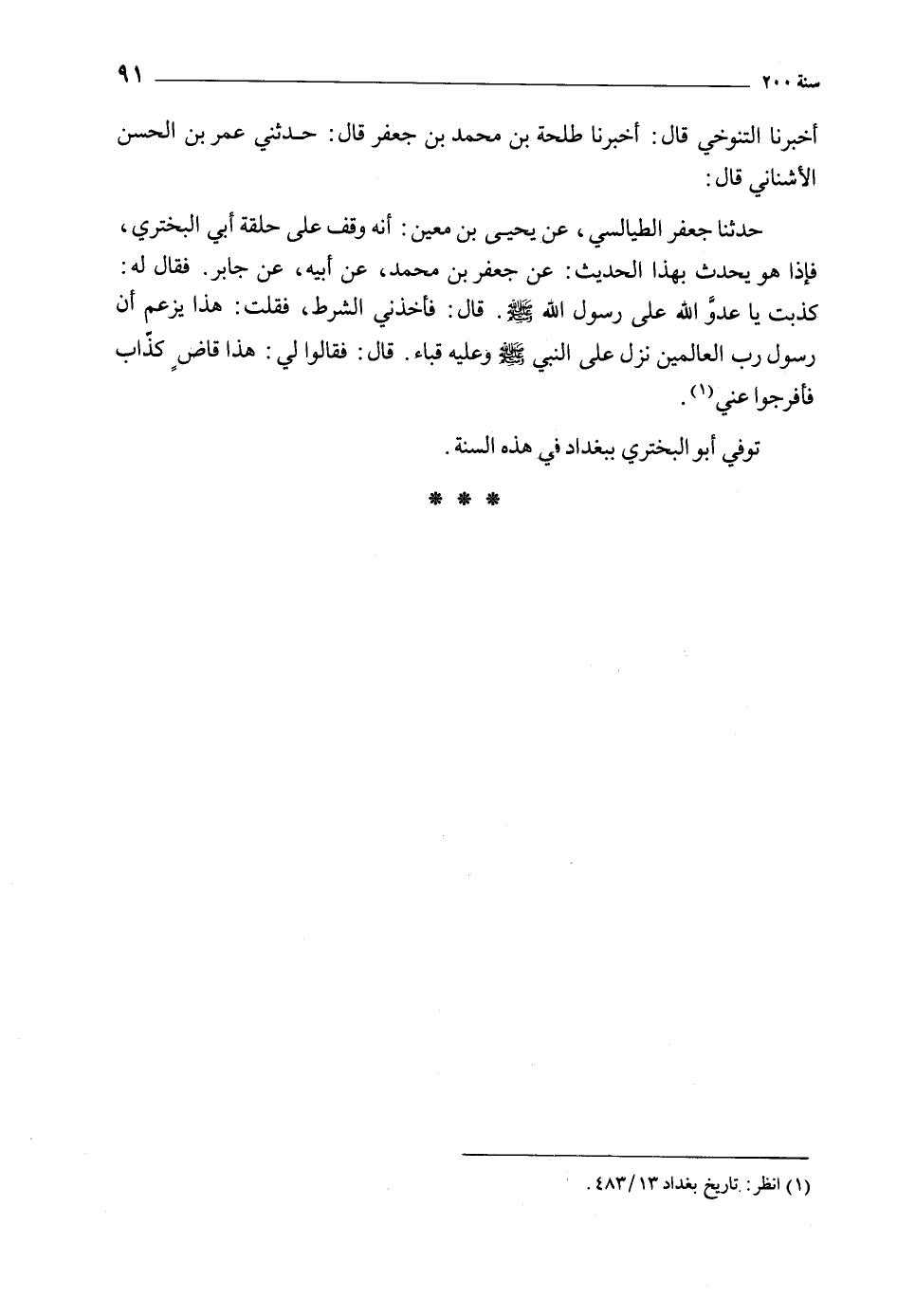 حدثنا جعفر الطيالسي، عن يحيى بن مَعِين: أنه وقف على حلقة أبي البختري، فإذا هو يحدث بهذا الحديث: عن جعفر بن محمد، عن أبيه، عن جابر. فَقَالَ له:
