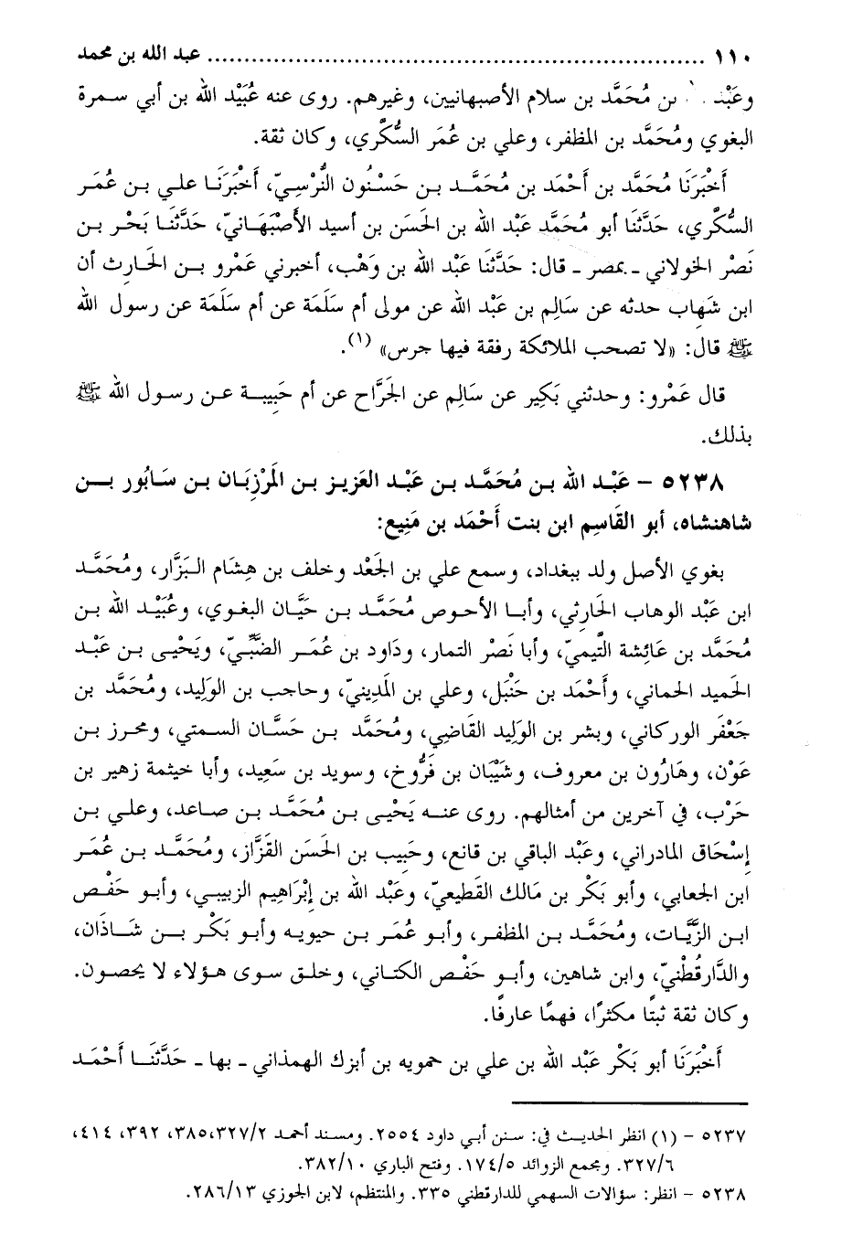 5238 عبد اللَّه بن مُحَمَّد بن عبد العزيز بن المرزبان بن سابور بن شاهنشاه، أبو القاسم ابن بنت أَحْمَد بن منيع [2] :