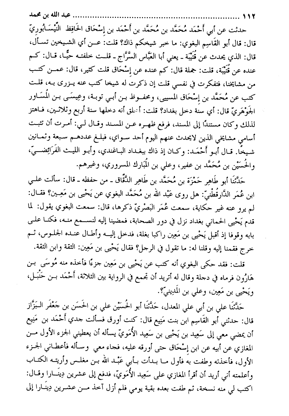 حَدَّثَنَا أَبُو طاهر حمزة بْن مُحَمَّد بْن طاهر الدقاق- من حفظه- قَالَ: سألت علي ابن عمر الدارقطني: هل روى عبد اللَّه بن مُحَمَّد البغوي عن يَحْيَى بن معين؟ فقَالَ: